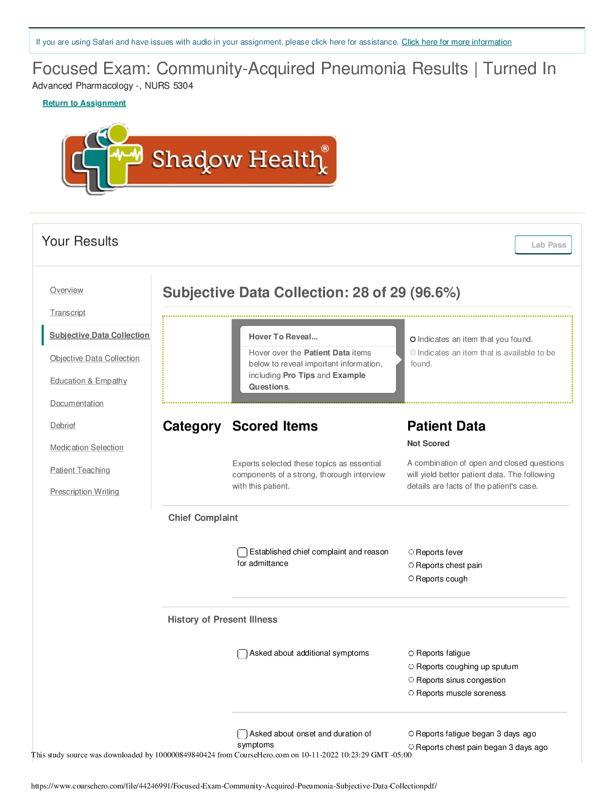 *NURSING > SHADOW HEALTH > Shadow Health Focused Exam Community-Acquired Pneumonia Results (Summer 2022) Subjective Data Collection 28 of 29 (96.6%).