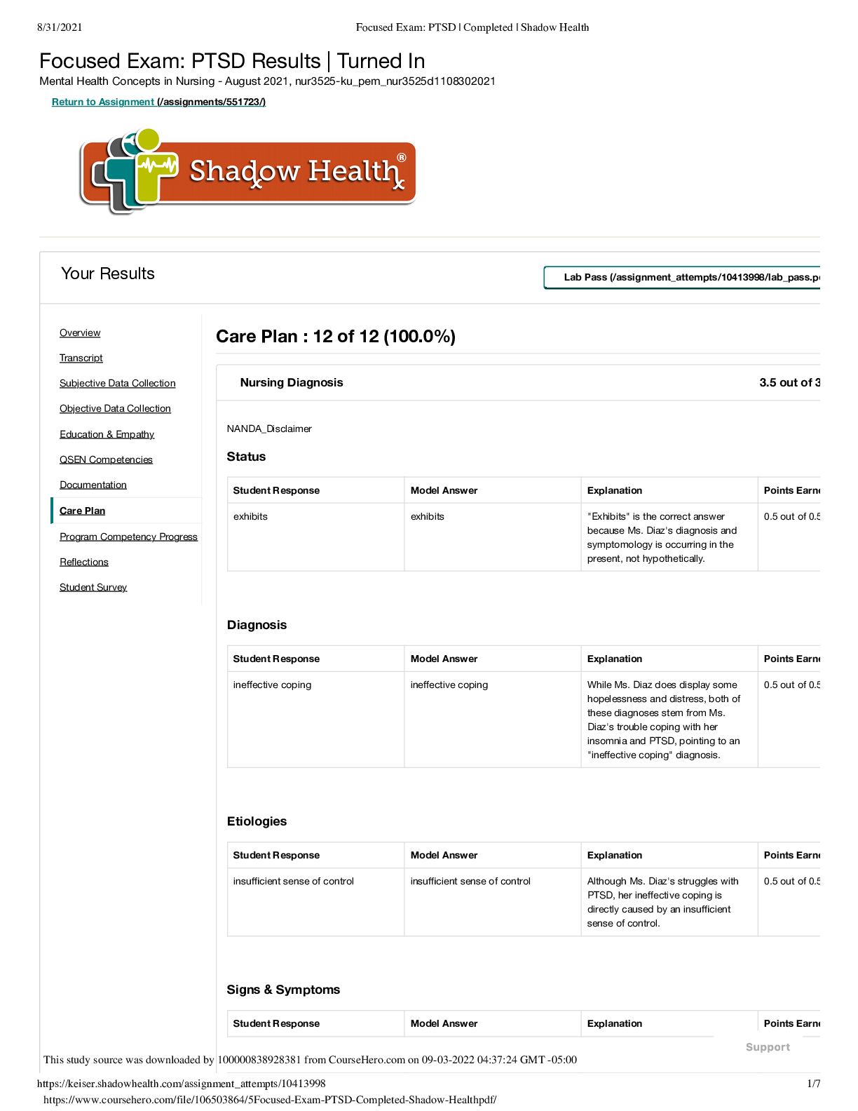 Health Care > SHADOW HEALTH > Focused Exam: PTSD | Mental Health | Completed | Shadow Health - Care Plan