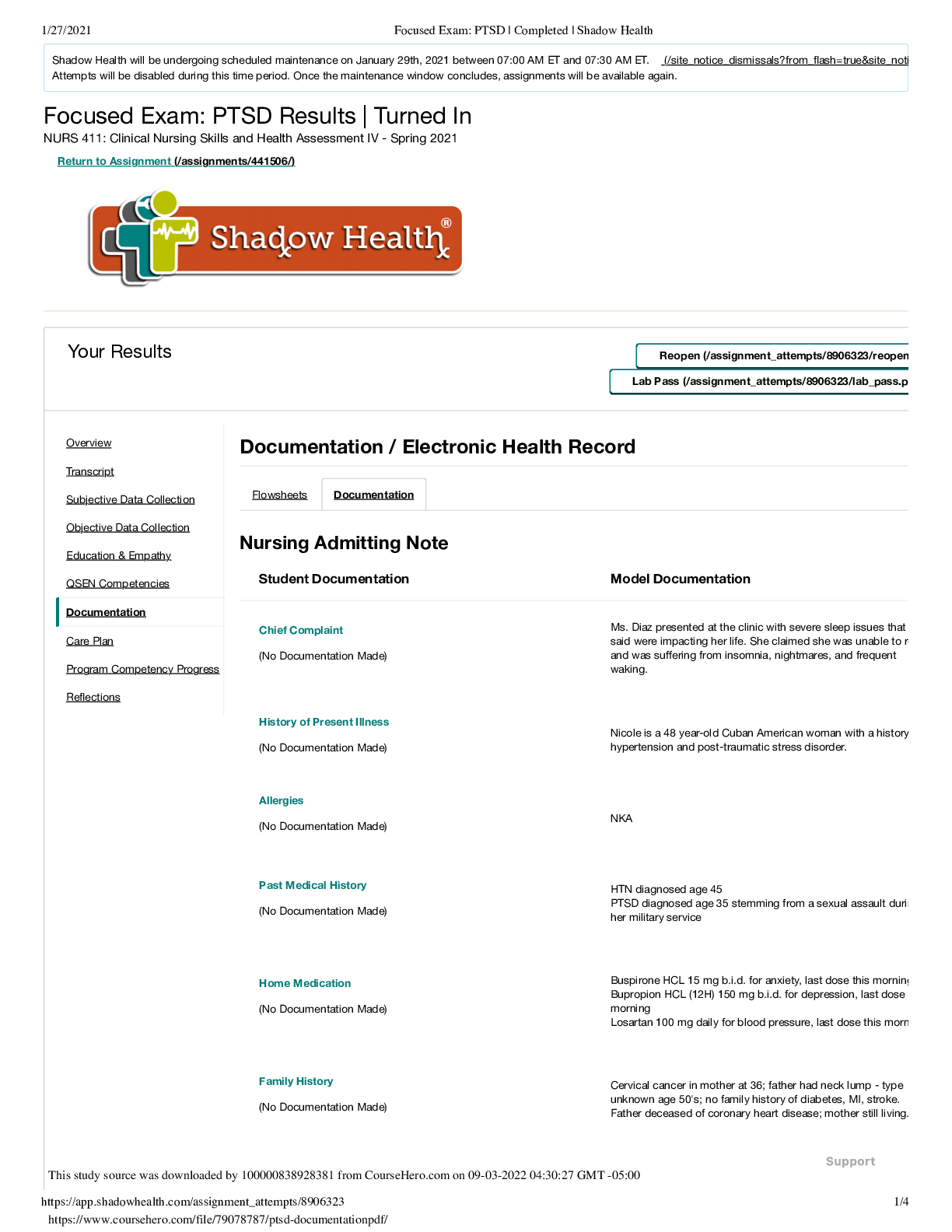 Health Care > SHADOW HEALTH > Focused Exam: PTSD | Completed | Shadow Health - Documentation / Electronic Health Record