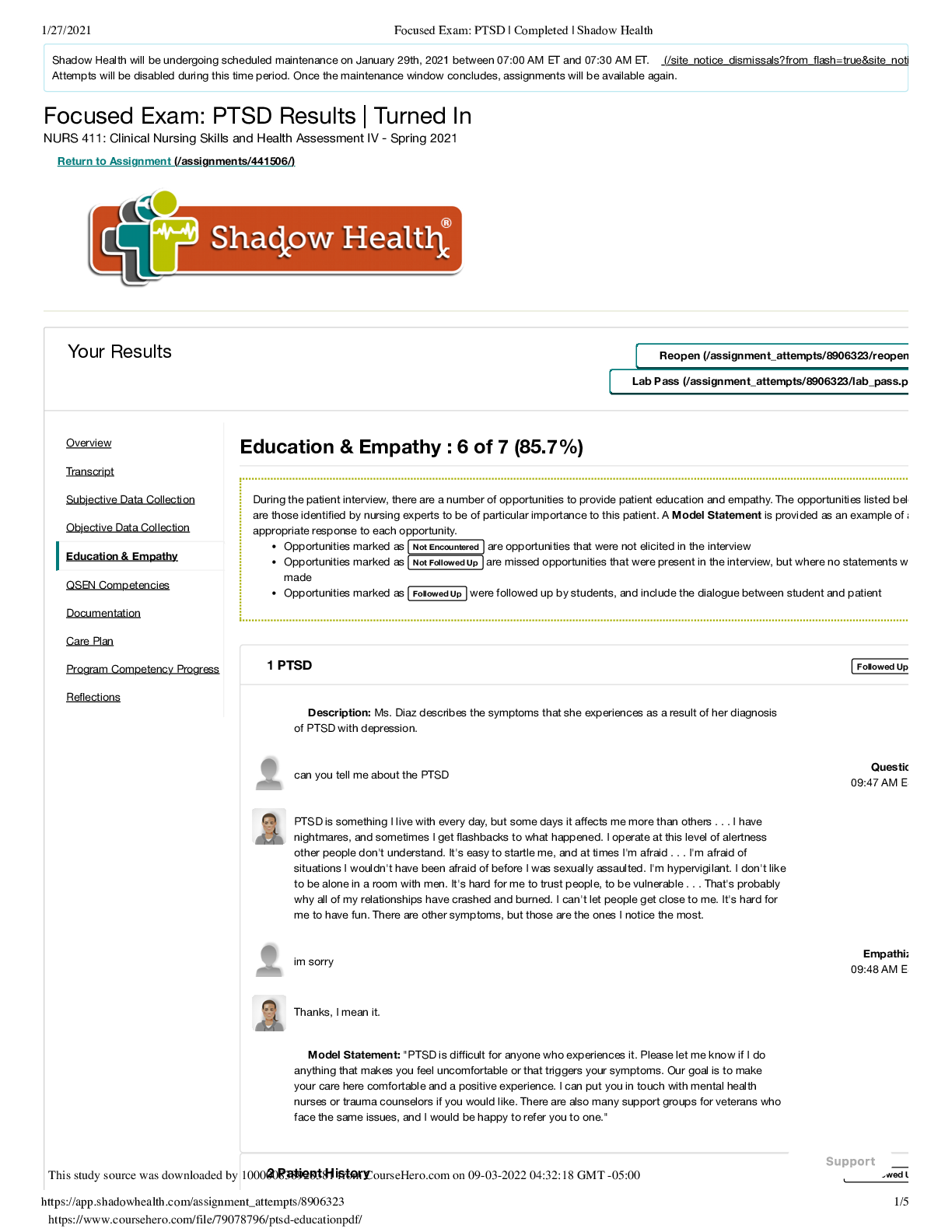 Health Care > SHADOW HEALTH > Focused Exam: PTSD | Completed | Shadow Health - Education & Empathy