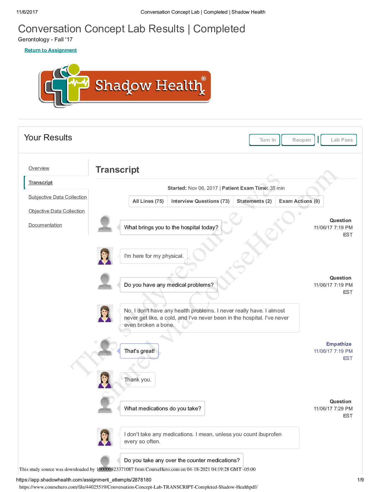 *NURSING > SHADOW HEALTH > NR 509 Advanced Physical Assessment/NR 509 Week 1 Shadow Health Conversation Concept Lab/Conversation Concept Lab TRANSCRIPT Completed Shadow Health(A+ Guide)