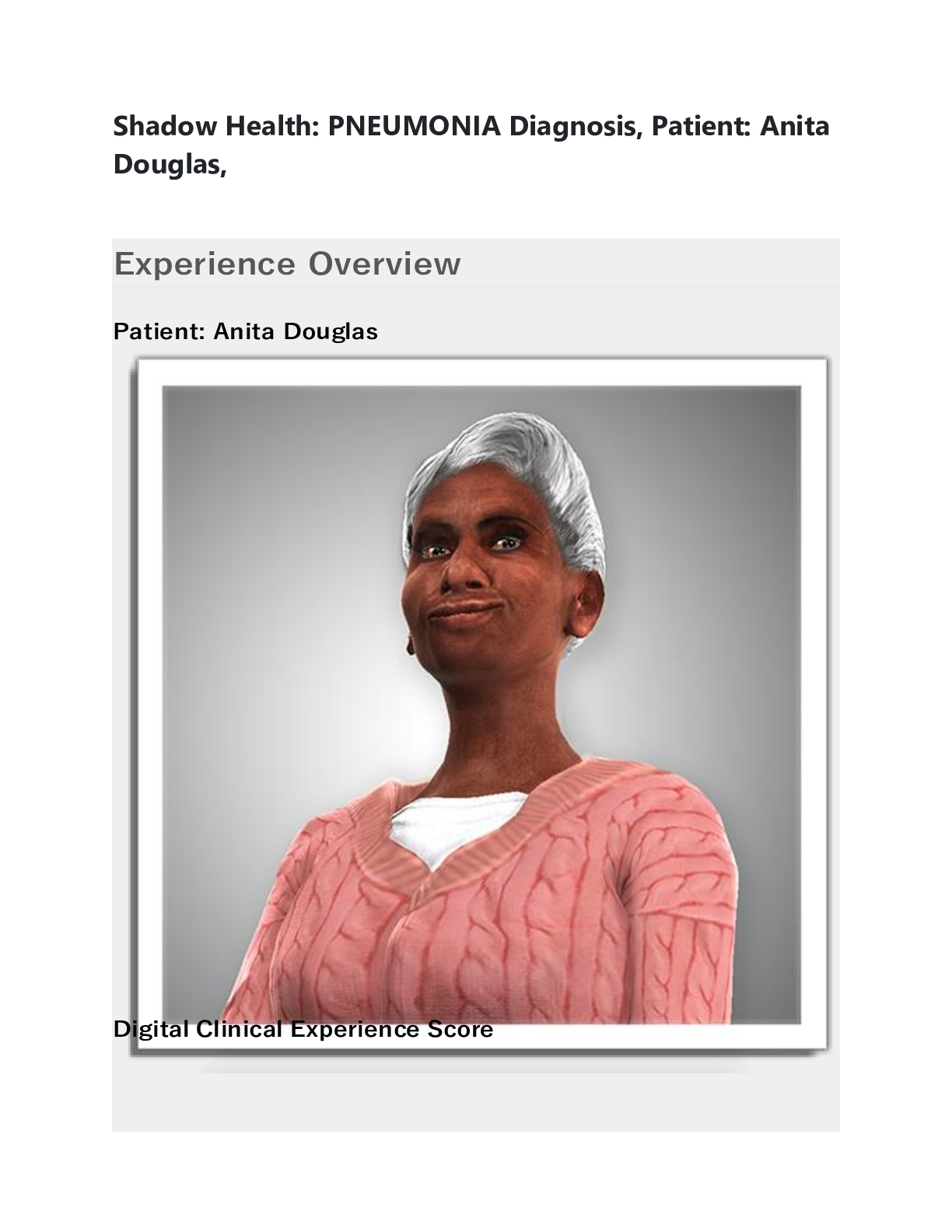 *NURSING > SHADOW HEALTH > Shadow Health: PNEUMONIA Diagnosis, Patient: Anita Douglas, (A Grade), Questions and Answers, All Correct Study Guide, Download to Score A