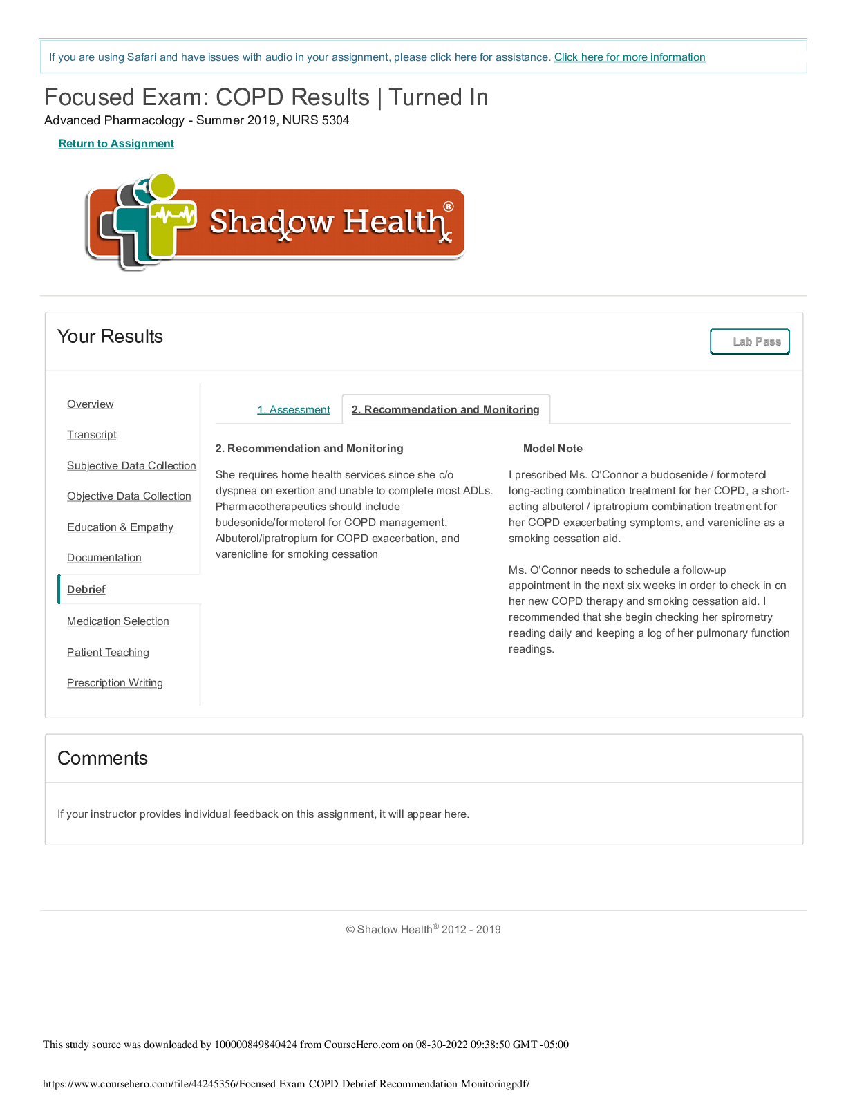 *NURSING > SHADOW HEALTH > (SOLVED) Shadow Health Focused Exam, COPD-Debrief Recommendation & Monitoring