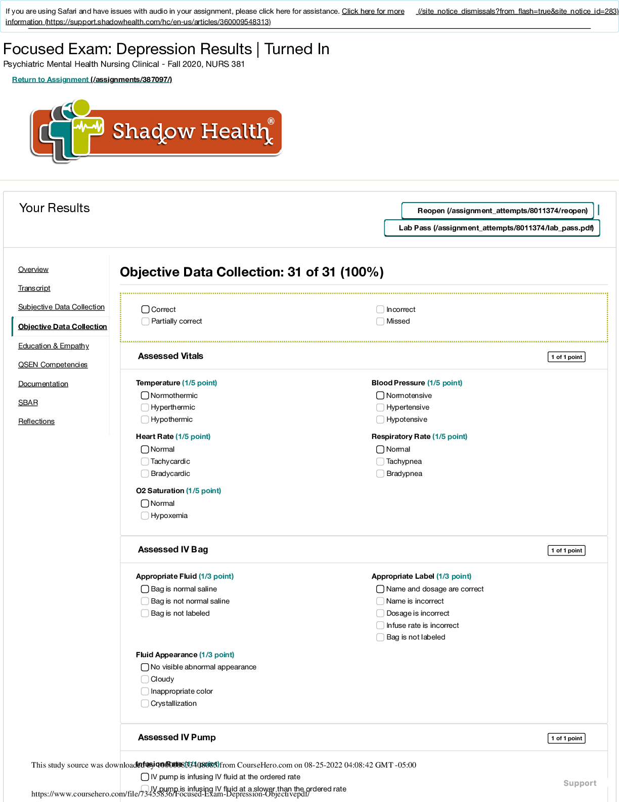 *NURSING > SHADOW HEALTH > Shadow Health | Focused Exam | Depression Results | 100% score | 6 pages