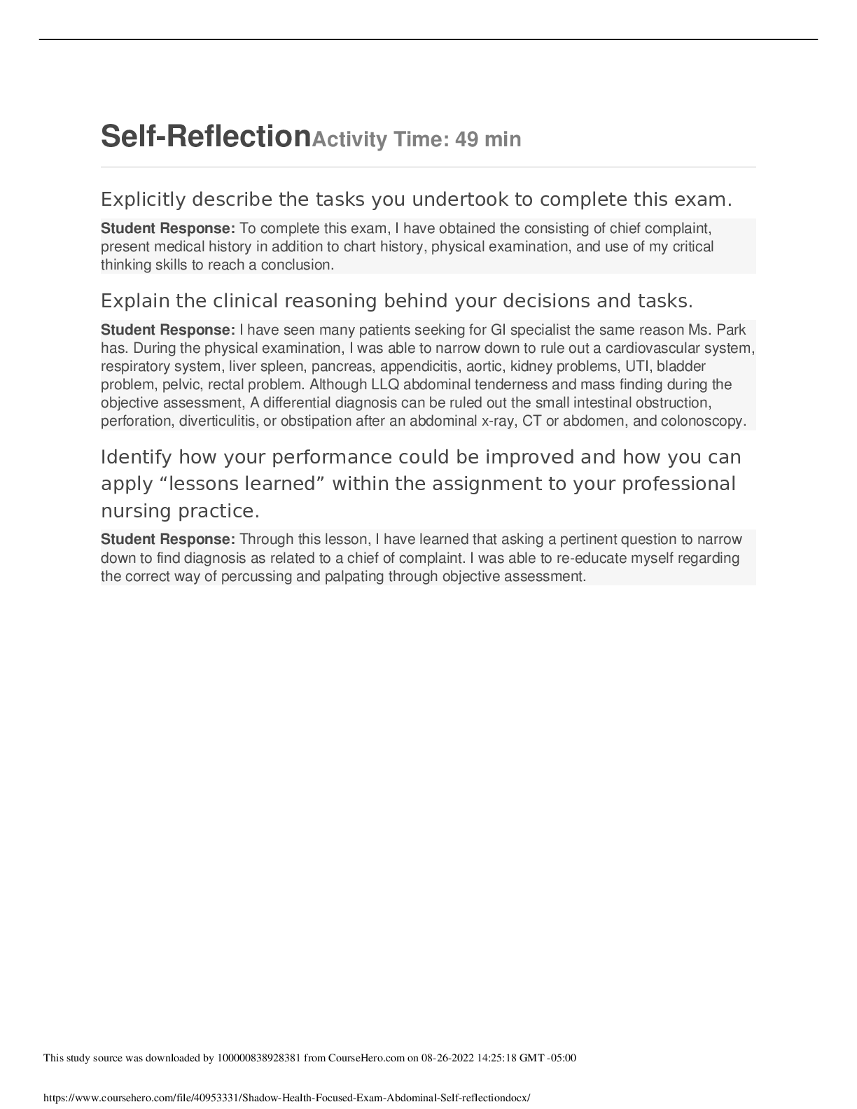 Health Care > SHADOW HEALTH > NR 509 Week 5 Shadow Health Focused Exam: Abdominal Pain(SELF REFLECTION)