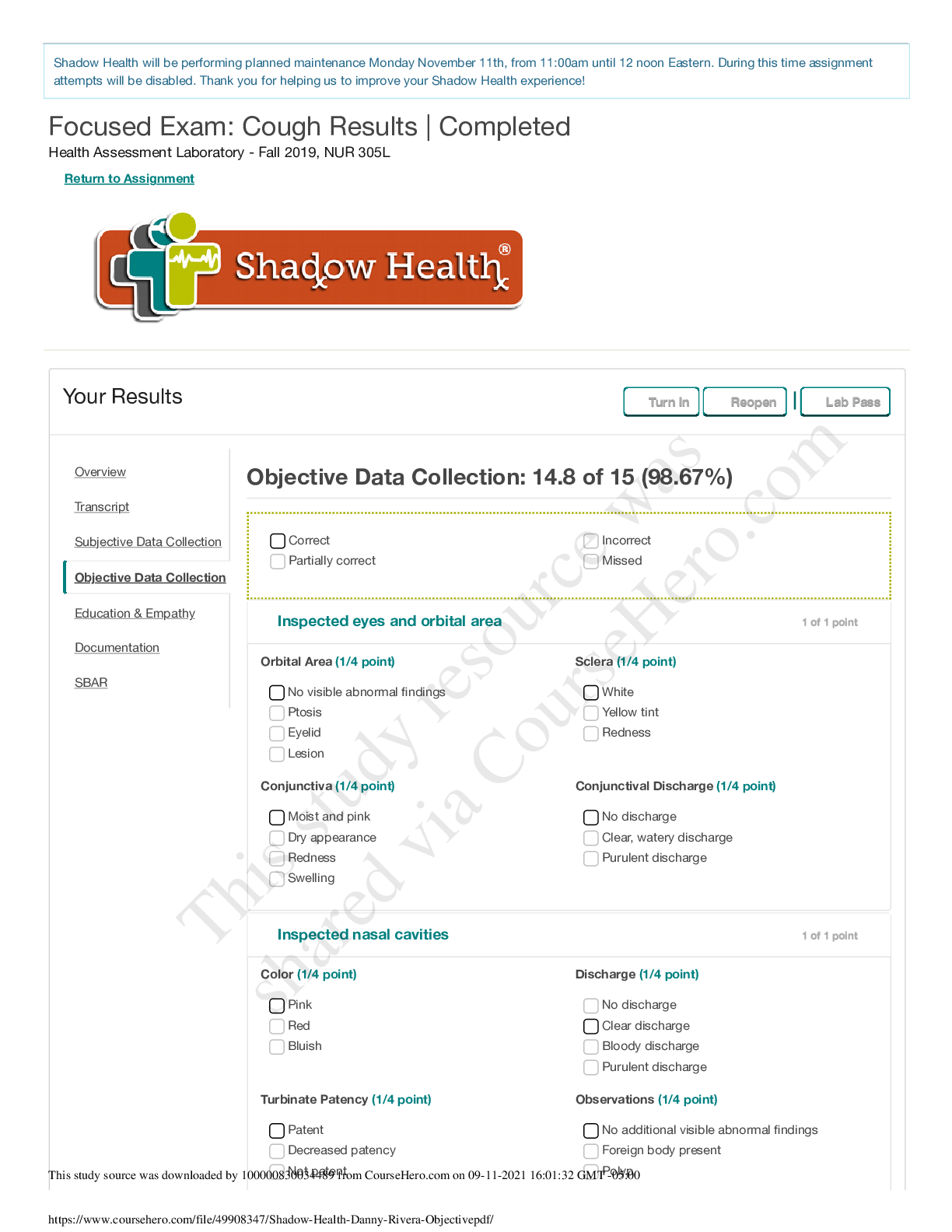 Health Care > SHADOW HEALTH > Chest Pain Assignment Results | Turned In Advanced Health Assessment - Chamberlain - October 2019, NR509-October-2019
