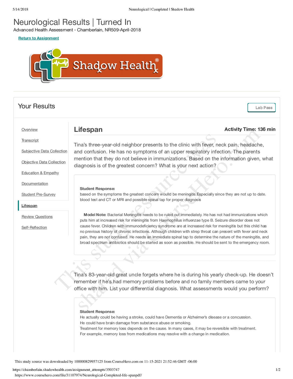 *NURSING > SHADOW HEALTH > NR 509 Neurological | Completed | life span.
