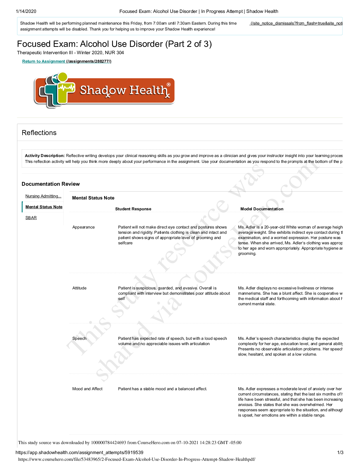 *NURSING > SHADOW HEALTH > Focused Exam_ Alcohol Use Disorder _ In Progress Attempt _ Shadow Health_Mental Status (PART 2 OF 3).