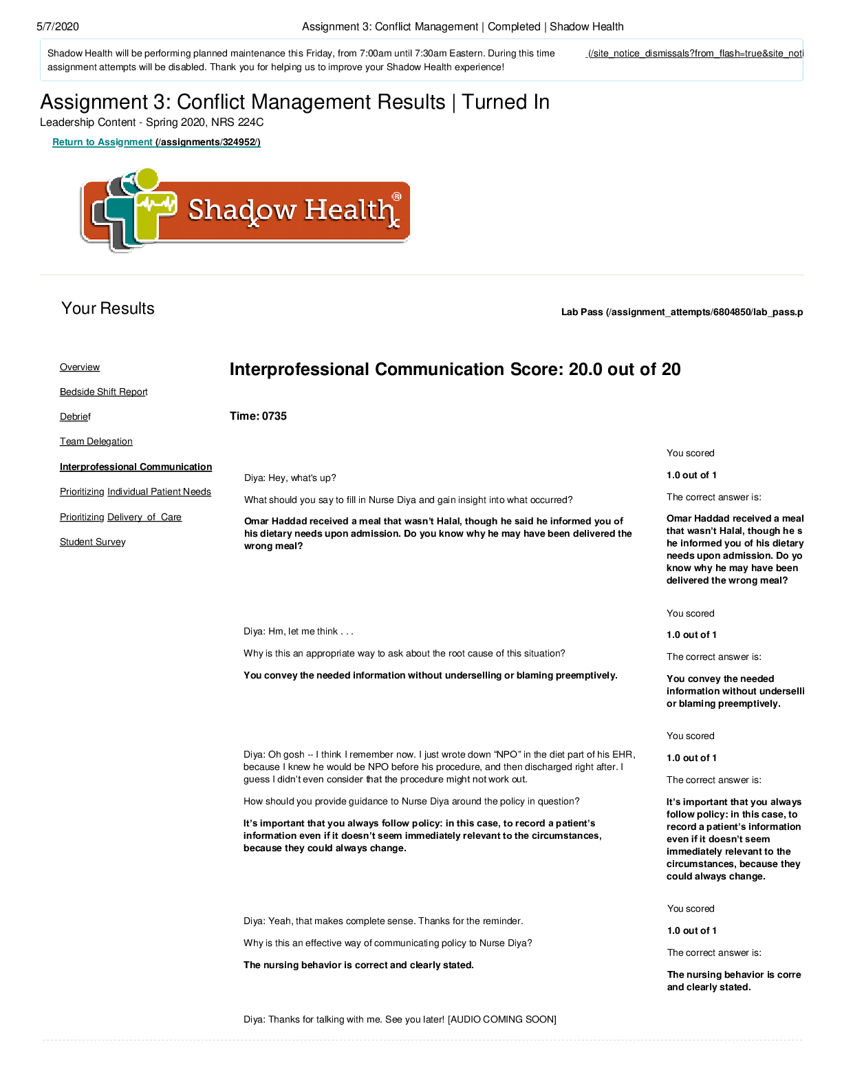 *NURSING > SHADOW HEALTH > NRS 224C Assignment 3: Conflict Management Completed Shadow Health Prioritizing Individual Patient; Score-20 Out of 20.