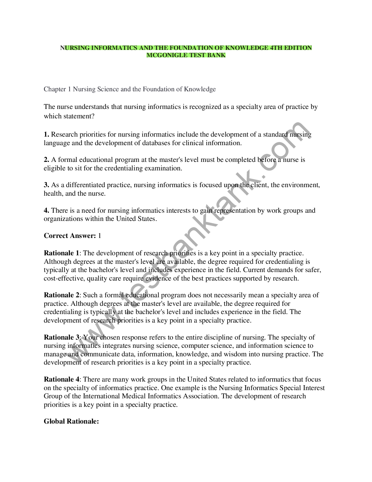 *NURSING > TEST BANKS > Nursing Informatics and the Foundation of Knowledge, 4th Edition test bank