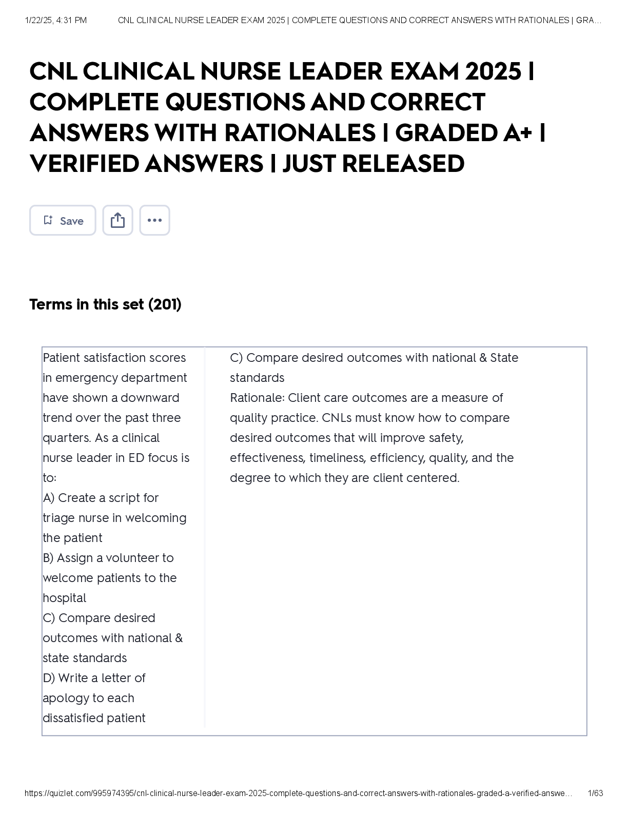 Clinical Medicine > TEST BANKS > CNL CLINICAL NURSE LEADER EXAM 2025 | COMPLETE QUESTIONS AND CORRECT ANSWERS WITH RATIONALES | GRADED A+