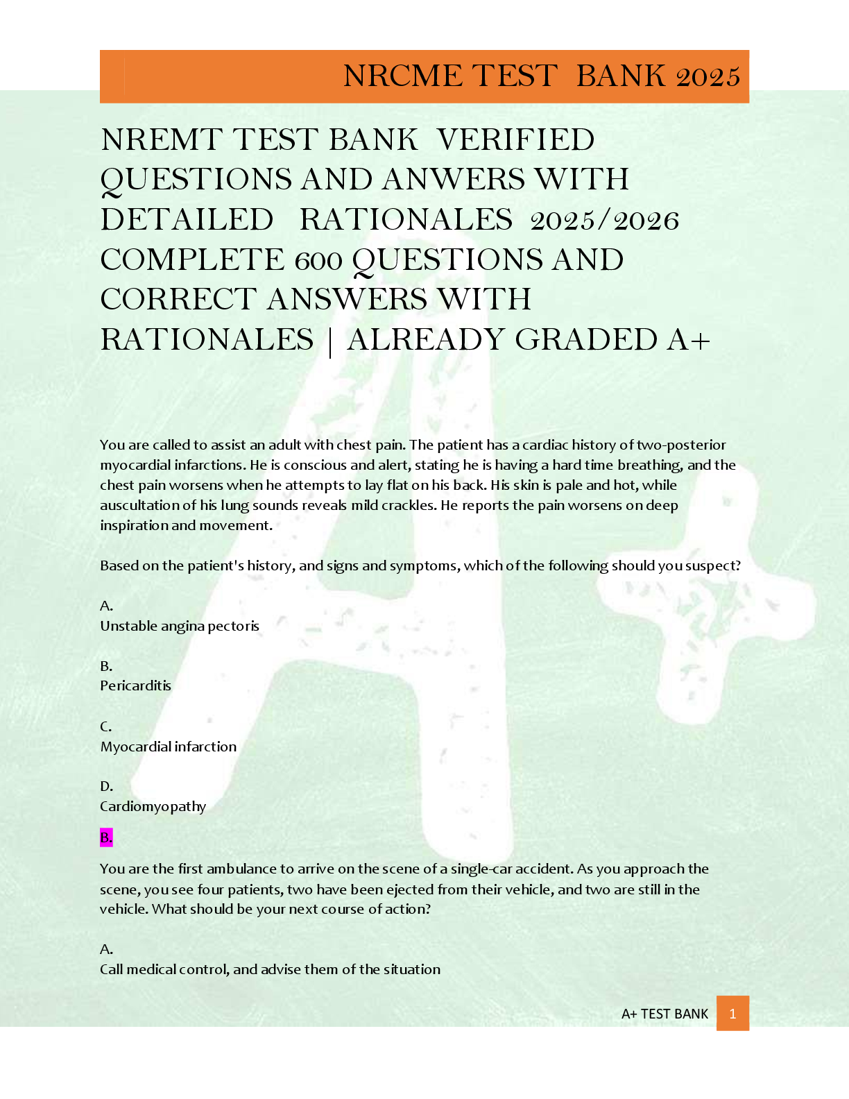 Cardiology > TEST BANKS > NREMT TEST BANK VERIFIED QUESTIONS AND ANWERS WITH DETAILED RATIONALES 2025/2026 COMPLETE 600 QUESTIONS AND CORRECT ANSWERS WITH RATIONALES | ALREADY GRADED A+
