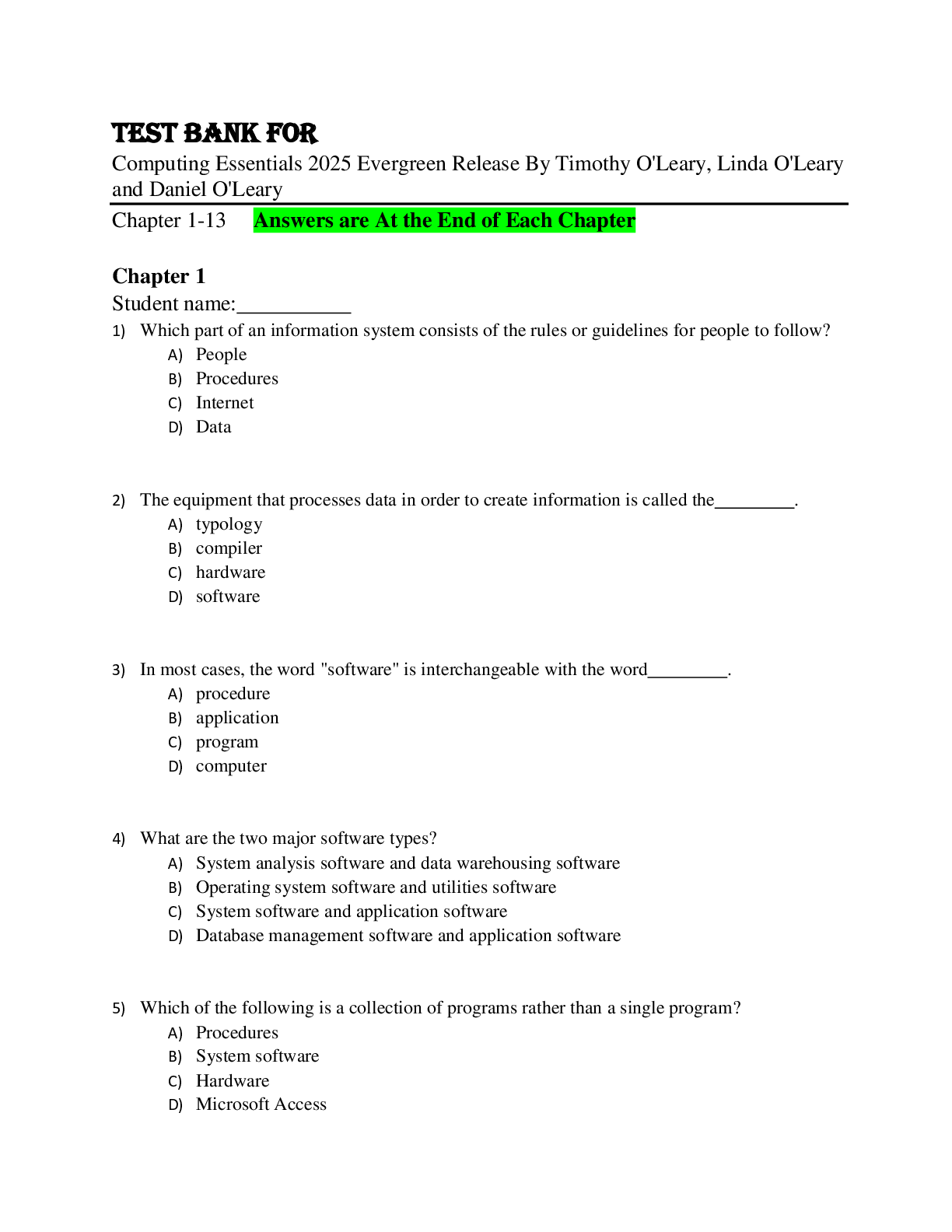 Business > TEST BANKS > Test Bank For Computing Essentials 2025 Evergreen Release By Timothy O'Leary, Linda O'Leary and Daniel O'Leary Chapter 1-13