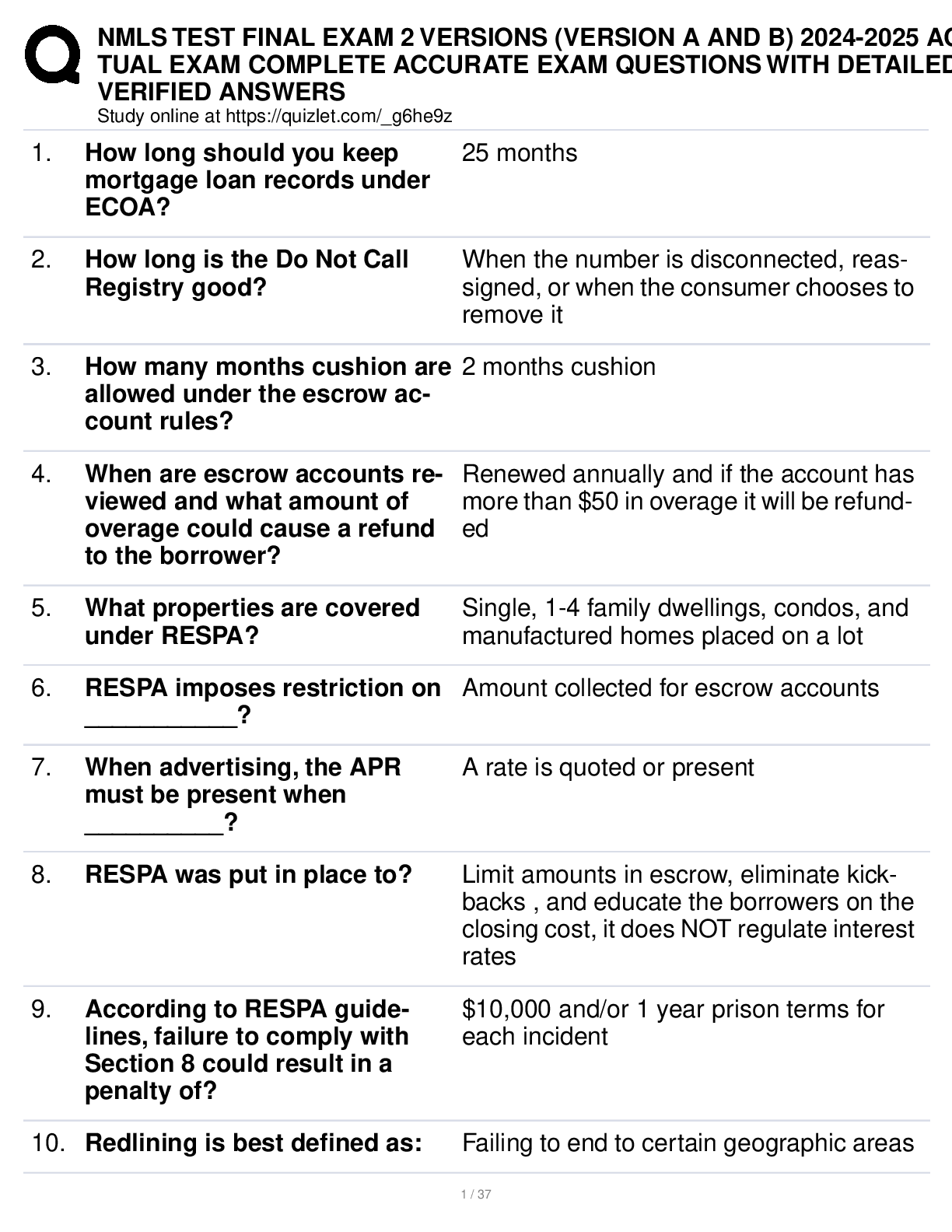 *NURSING > TEST BANKS > NMLS TEST FINAL EXAM 2 VERSIONS (VERSION A AND B) 2024-2025 ACTUAL EXAM COMPLETE ACCURATE EXAM QUESTIONS WITH DETAILED VERIFIED ANSWERS A+