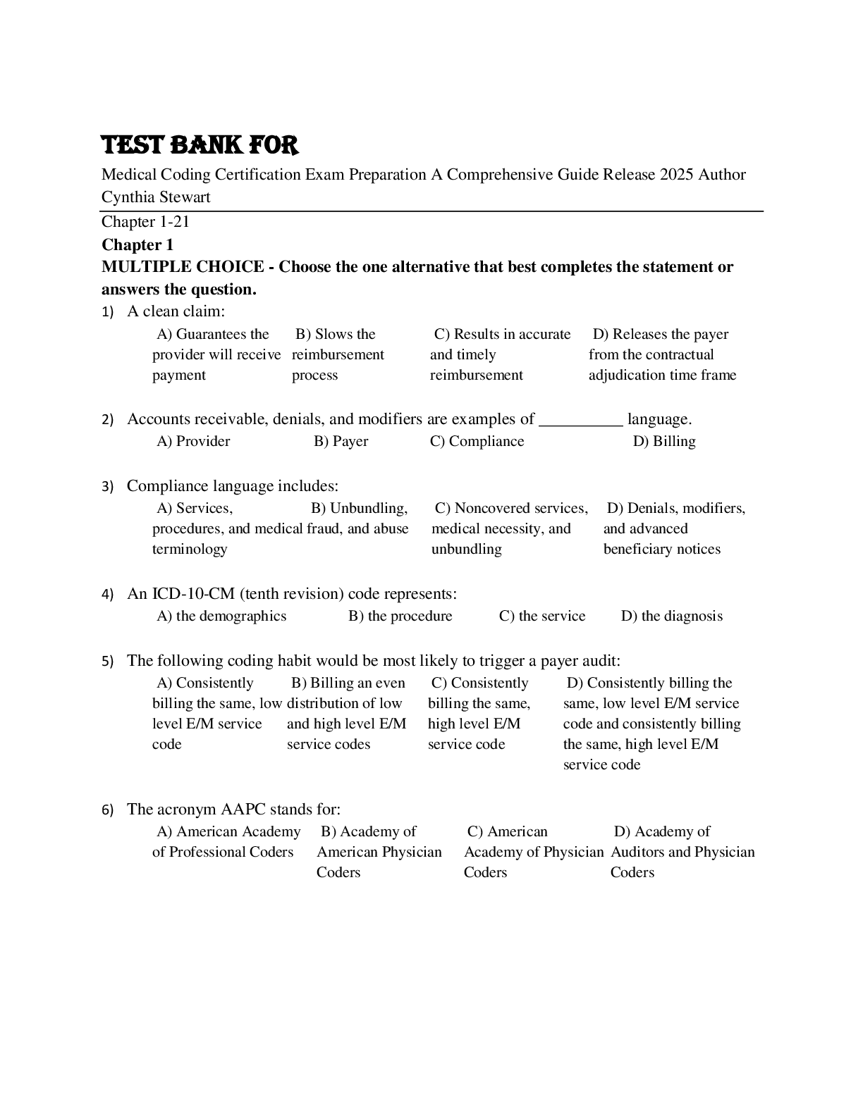 Business > TEST BANKS > Test Bank For Medical Coding Certification Exam Preparation A Comprehensive Guide Release 2025 Author Cynthia Stewart