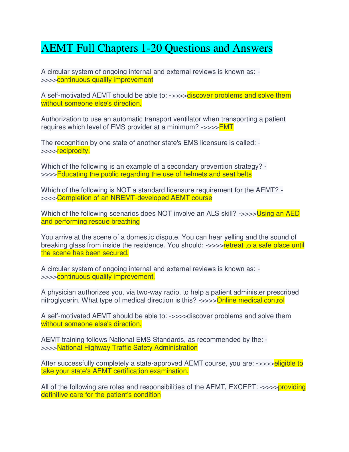 Emergency Medicine > TEST BANKS > AEMT Full Chapters 1-20 Complete with Questions and Correct Answers