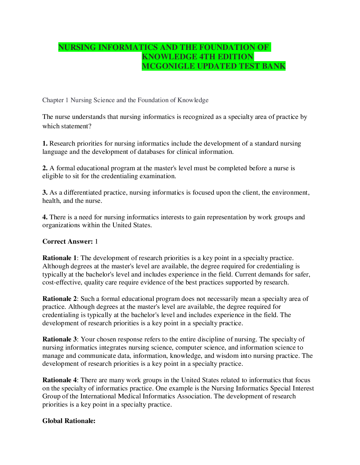 *NURSING > TEST BANKS > NURSING INFORMATICS AND THE FOUNDATION OF KNOWLEDGE 4TH EDITION MCGONIGLE UPDATED TESTBANK
