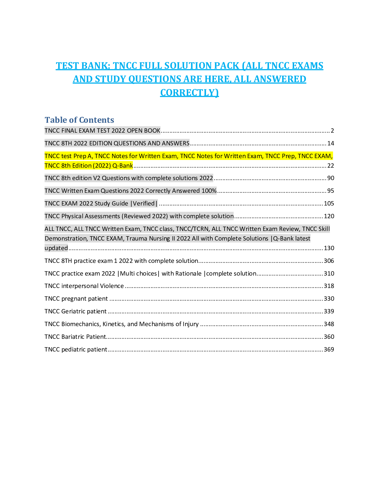 Health Care > TEST BANKS > TEST BANK; TNCC FULL SOLUTION PACK (ALL TNCC EXAMS AND STUDY QUESTIONS ARE HERE, ALL ANSWERED CORRECTLY)