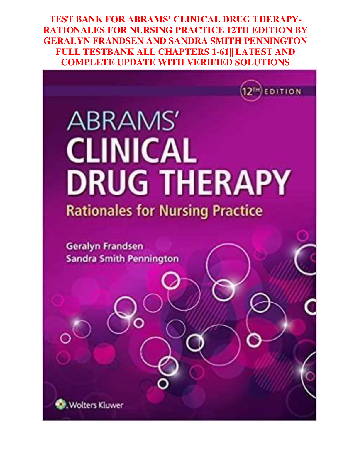 *NURSING > TEST BANKS > TEST BANK FOR ABRAMS’ CLINICAL DRUG THERAPYRATIONALES FOR NURSING PRACTICE 12TH EDITION BY GERALYN FRANDSEN AND SANDRA SMITH PENNINGTON FULL TESTBANK ALL CHAPTERS 1-61|| LATEST AND COMPLETE UPDATE WITH VERIFIED SOLUTIONS