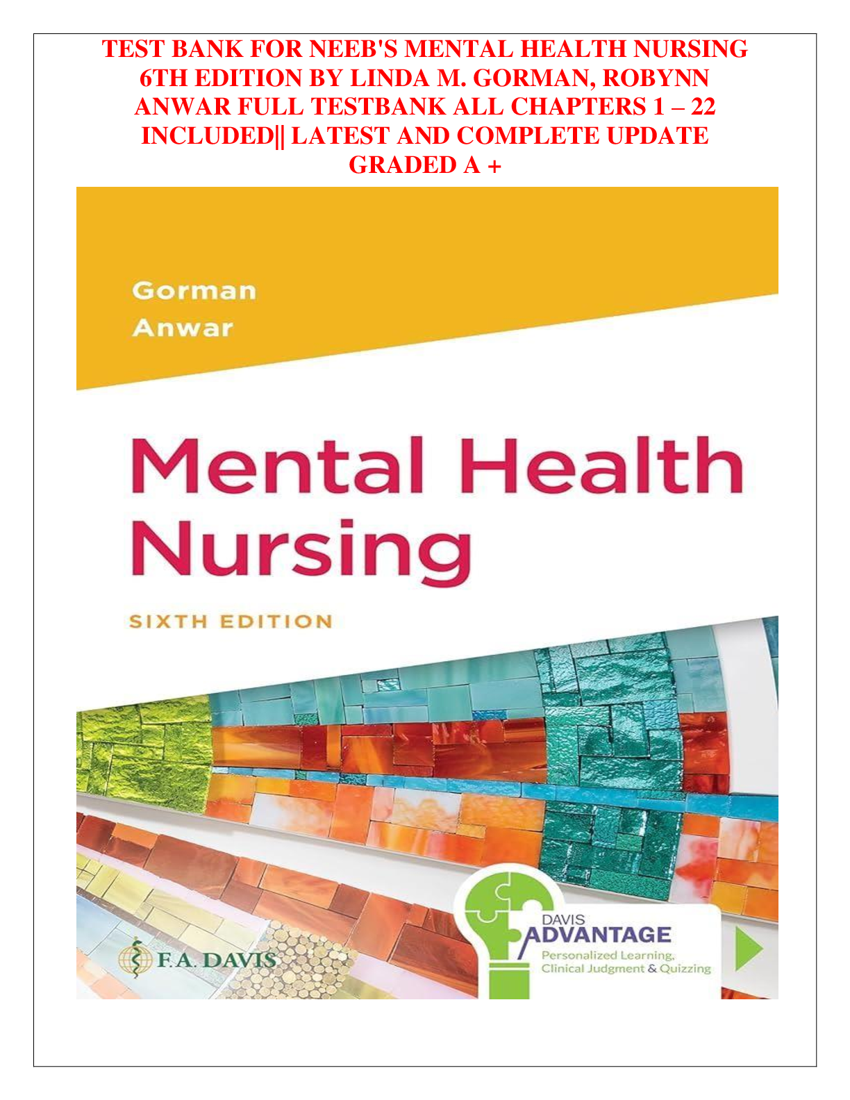 *NURSING > TEST BANKS > TEST BANK FOR NEEB'S MENTAL HEALTH NURSING 6TH EDITION BY LINDA M. GORMAN, ROBYNN ANWAR FULL TESTBANK ALL CHAPTERS 1 – 22 INCLUDED|| LATEST AND COMPLETE UPDATE GRADED A +