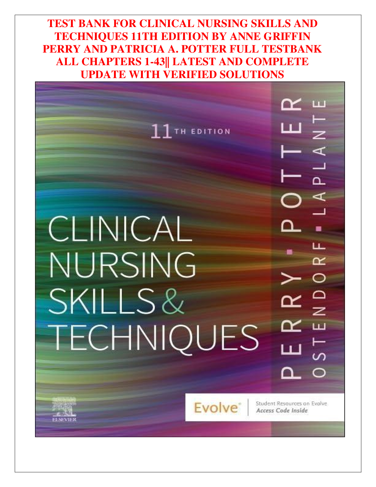 *NURSING > TEST BANKS > TEST BANK FOR CLINICAL NURSING SKILLS AND TECHNIQUES 11TH EDITION BY ANNE GRIFFIN PERRY AND PATRICIA A. POTTER FULL TESTBANK ALL CHAPTERS 1-43|| LATEST AND COMPLETE UPDATE WITH VERIFIED SOLUTIONS