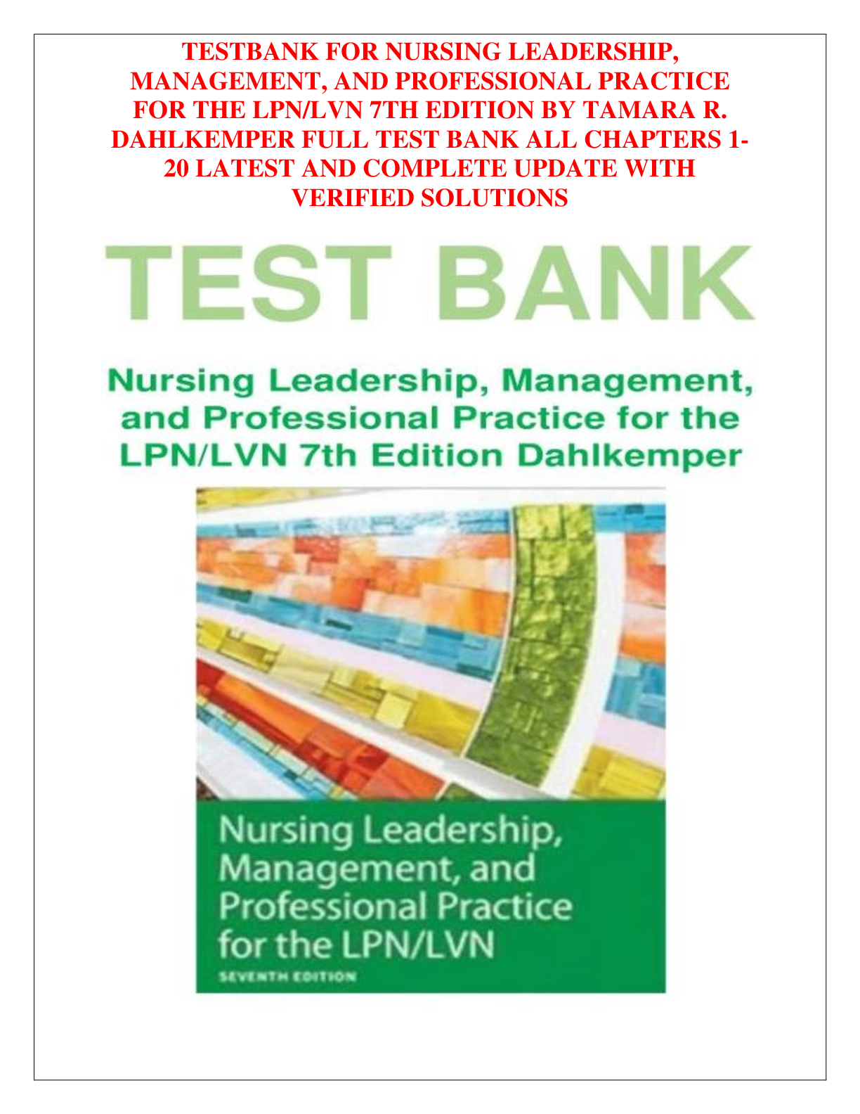 *NURSING > TEST BANKS > TESTBANK FOR NURSING LEADERSHIP, MANAGEMENT, AND PROFESSIONAL PRACTICE FOR THE LPN/LVN 7TH EDITION BY TAMARA R. DAHLKEMPER FULL TEST BANK ALL CHAPTERS 1- 20 LATEST AND COMPLETE UPDATE WITH VERIFIED SOLUTIONS