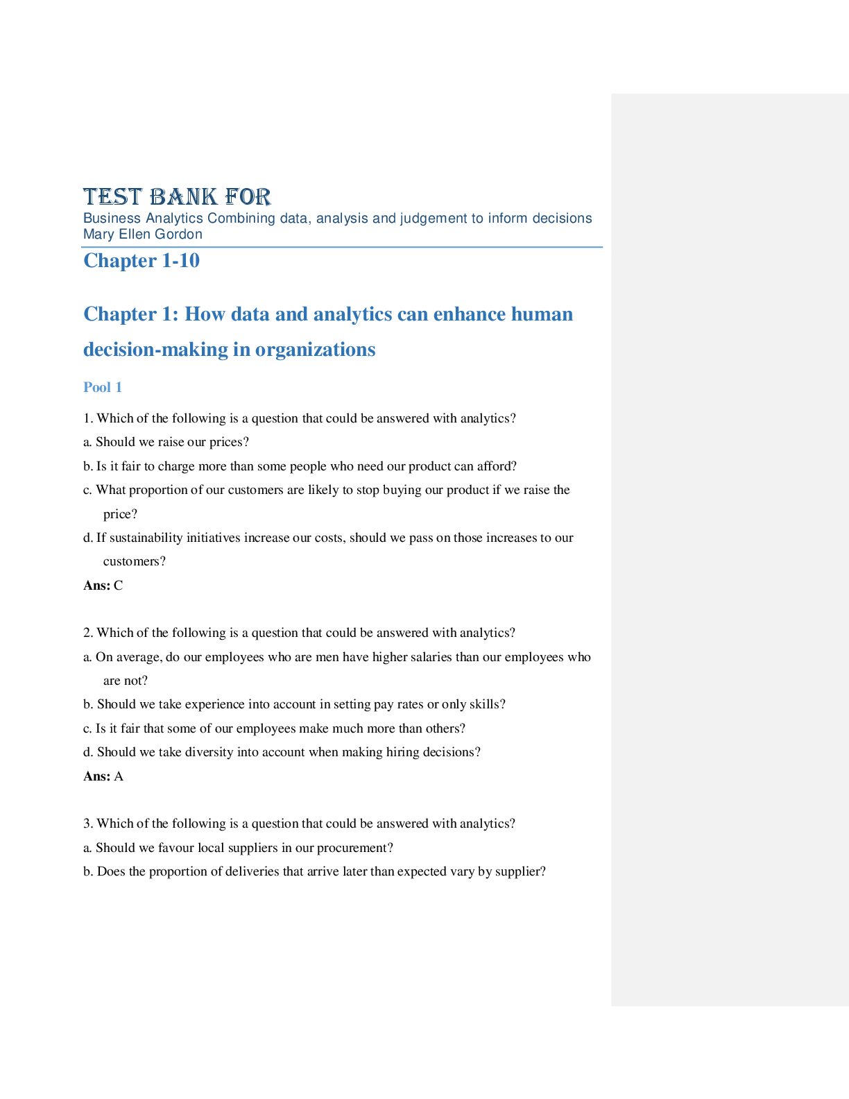 Business > TEST BANKS > Test Bank For Business Analytics Combining data, analysis and judgement to inform decisions Mary Ellen Gordon