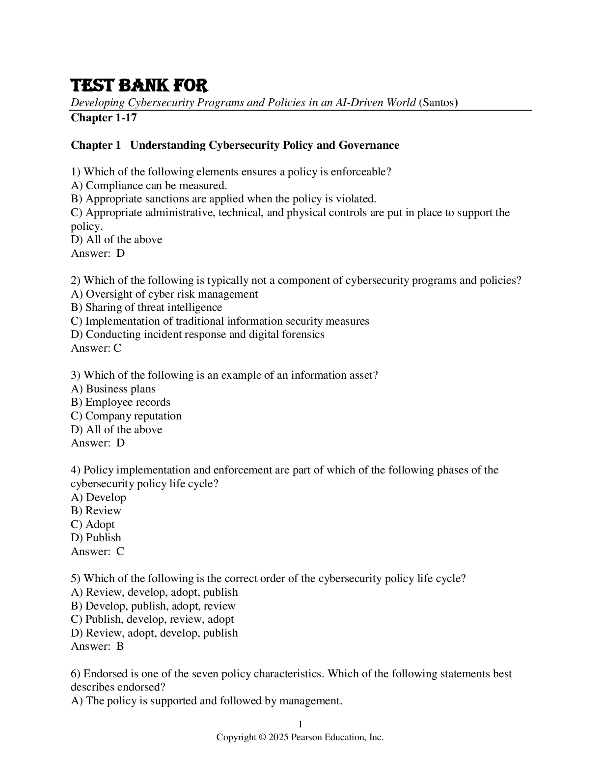 Business > TEST BANKS > Test Bank For Developing Cybersecurity Programs and Policies, 4th Edition Omar Santos
