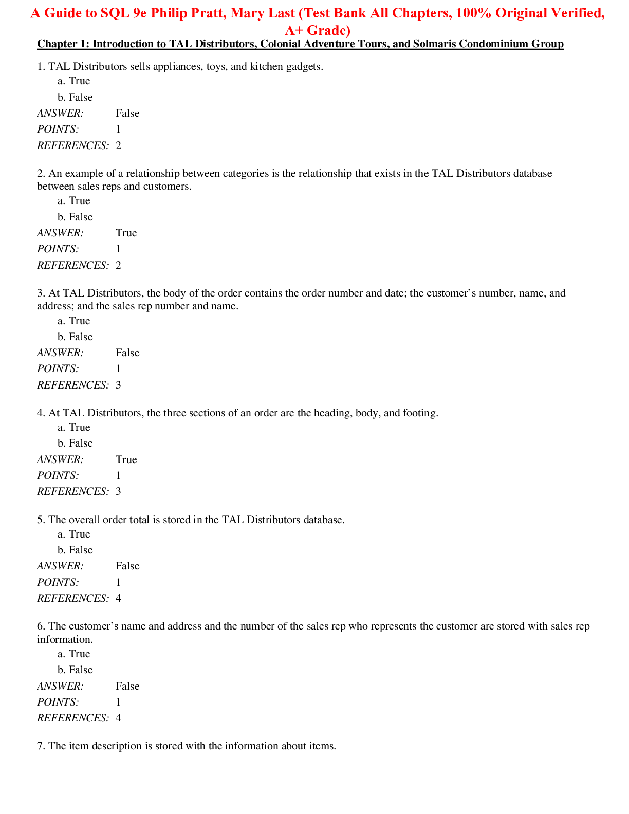 Basic Statistics > TEST BANKS > Test Bank For A Guide to SQL 8th Edition By Philip Pratt, Mary Last | All Chapters, 100% Original Verified, A+ Grade) Answers at the end of each Chapter.