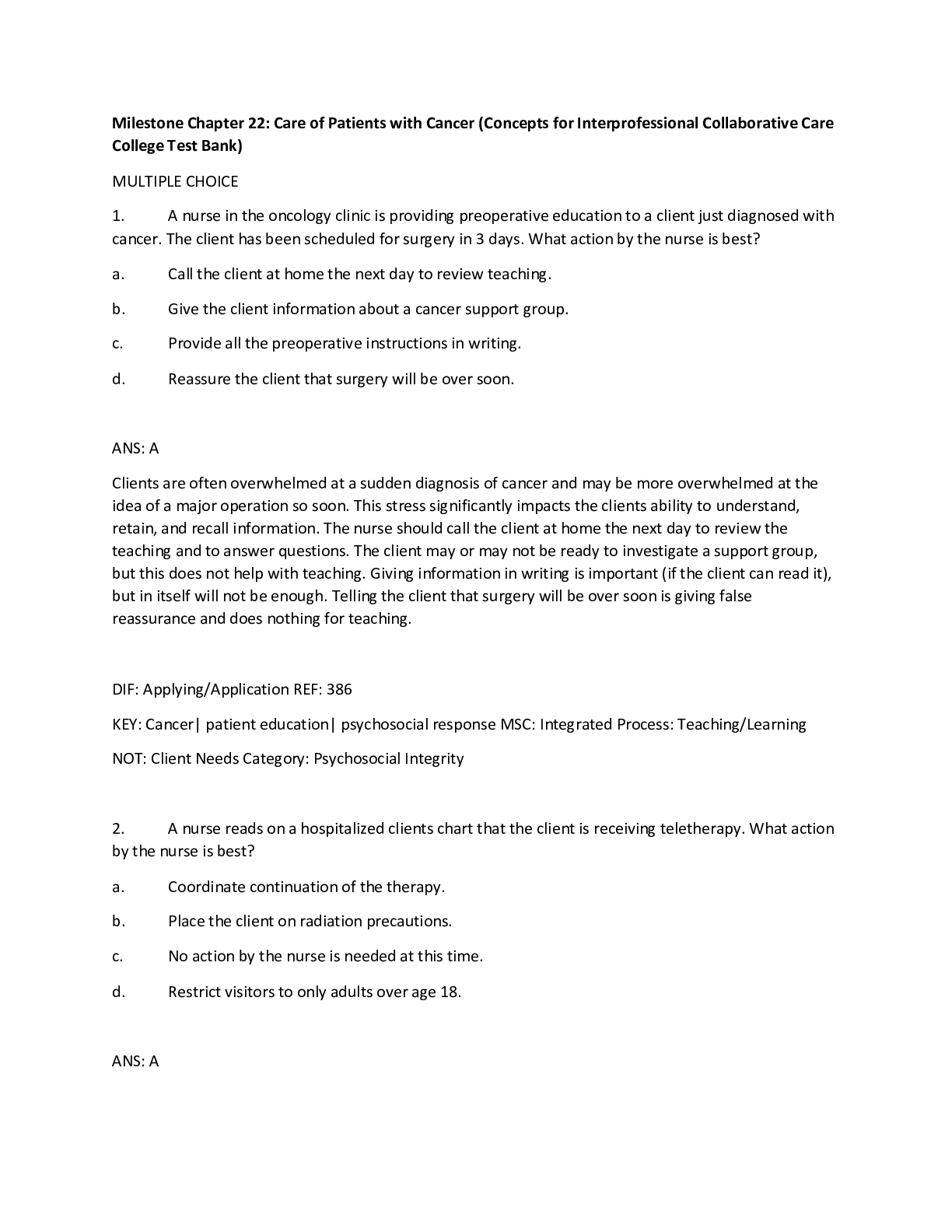 *NURSING > MILESTONE > Milestone Chapter 22 Care of Patients with Cancer (Concepts for Interprofessional Collaborative Care College Test Bank)