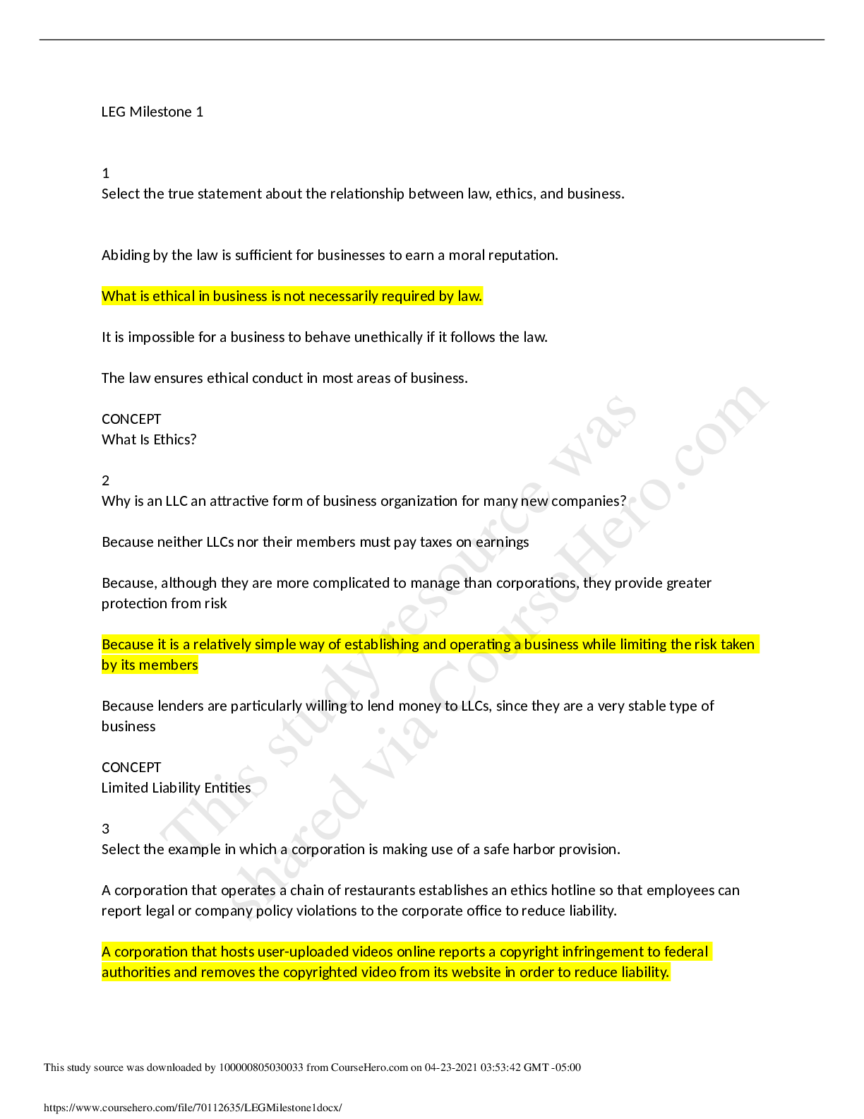 Business Law > MILESTONE > LEG 100 STRAYER UNIVERSITY Business Law LEG Milestone 1 FINAL EXAM 1. 100% USEFUL Study Guide