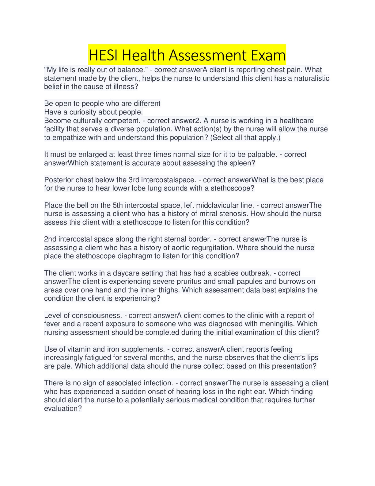 Health Care > HESI > HESI HEALTH ASSESSMENT Questions & Answers/ Latest Updated