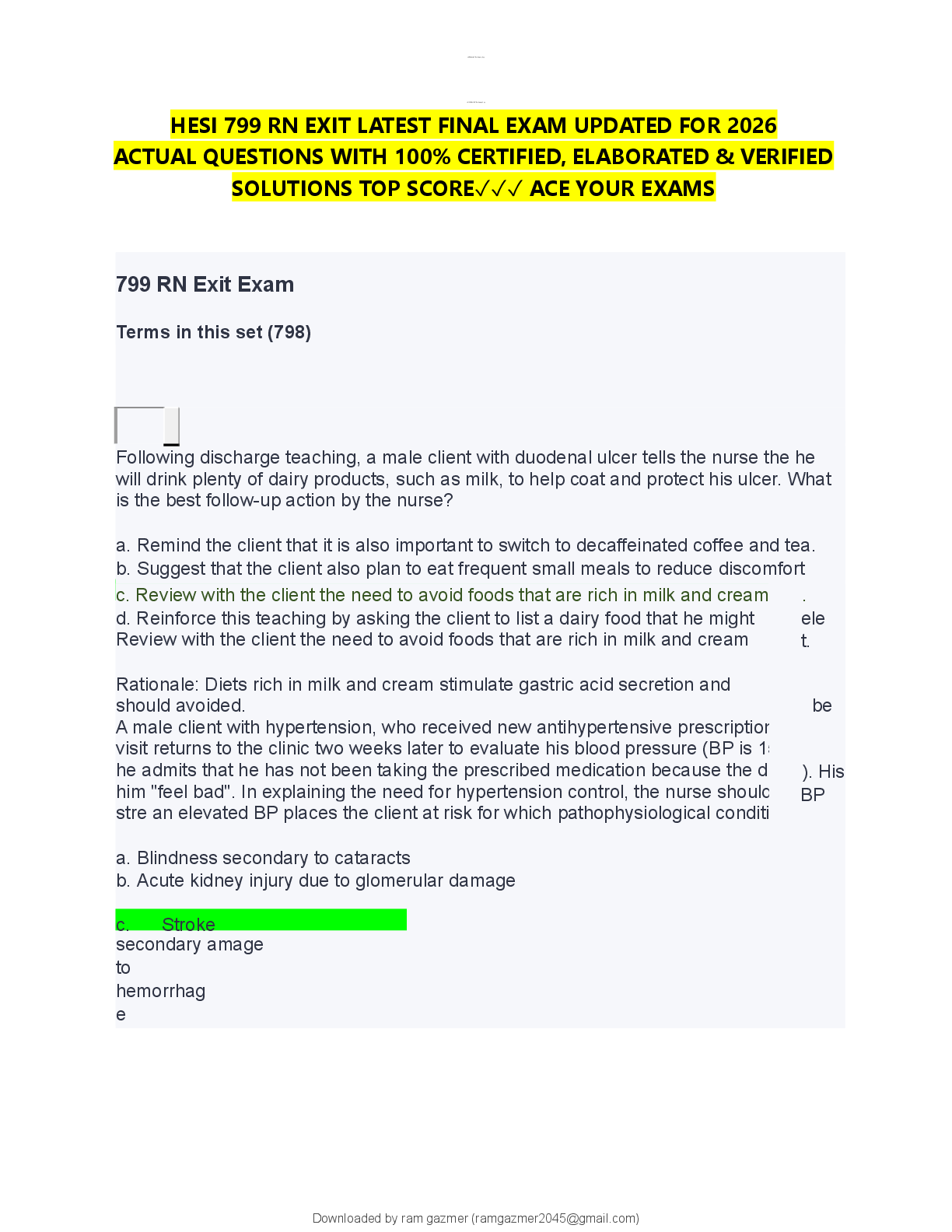 *NURSING > HESI > HESI 799 RN EXIT LATEST FINAL EXAM UPDATED FOR 2026 ACTUAL QUESTIONS WITH 100% CERTIFIED, ELABORATED & VERIFIED SOLUTIONS TOP SCORE✓✓✓ ACE YOUR EXAMS