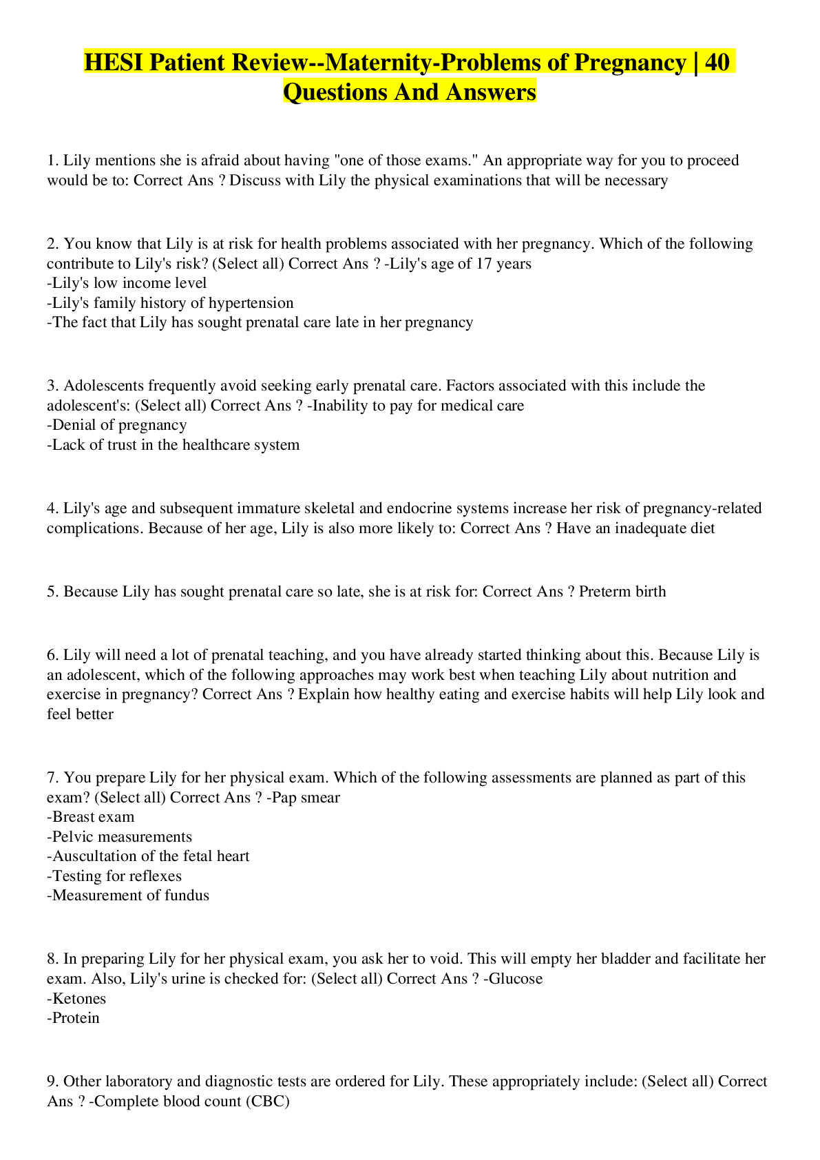 Health Care > HESI > HESI Patient Review--Maternity-Problems of Pregnancy | 40 Questions And Answers