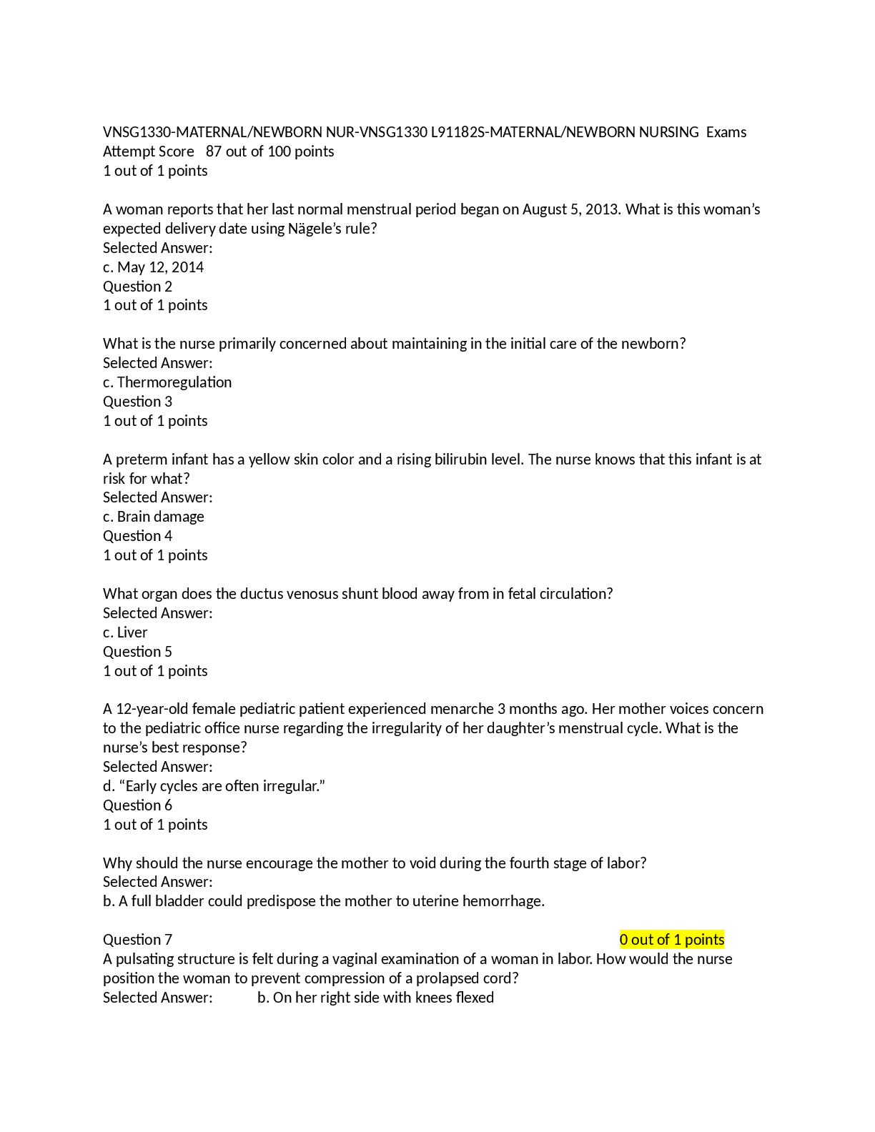 *NURSING > MEDICAL STUDY RESOURCES > NUR-VNSG1330 L91182S MATERNAL NEWBORN NURSING EXAM (1)