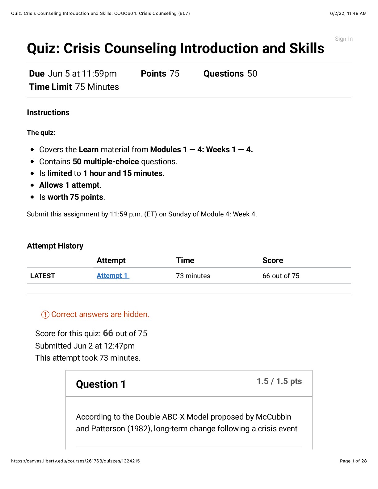 *NURSING > ATI MEDICAL SURGICAL > COUC 604 Quiz1 Crisis Counseling Introduction and Skills 2023