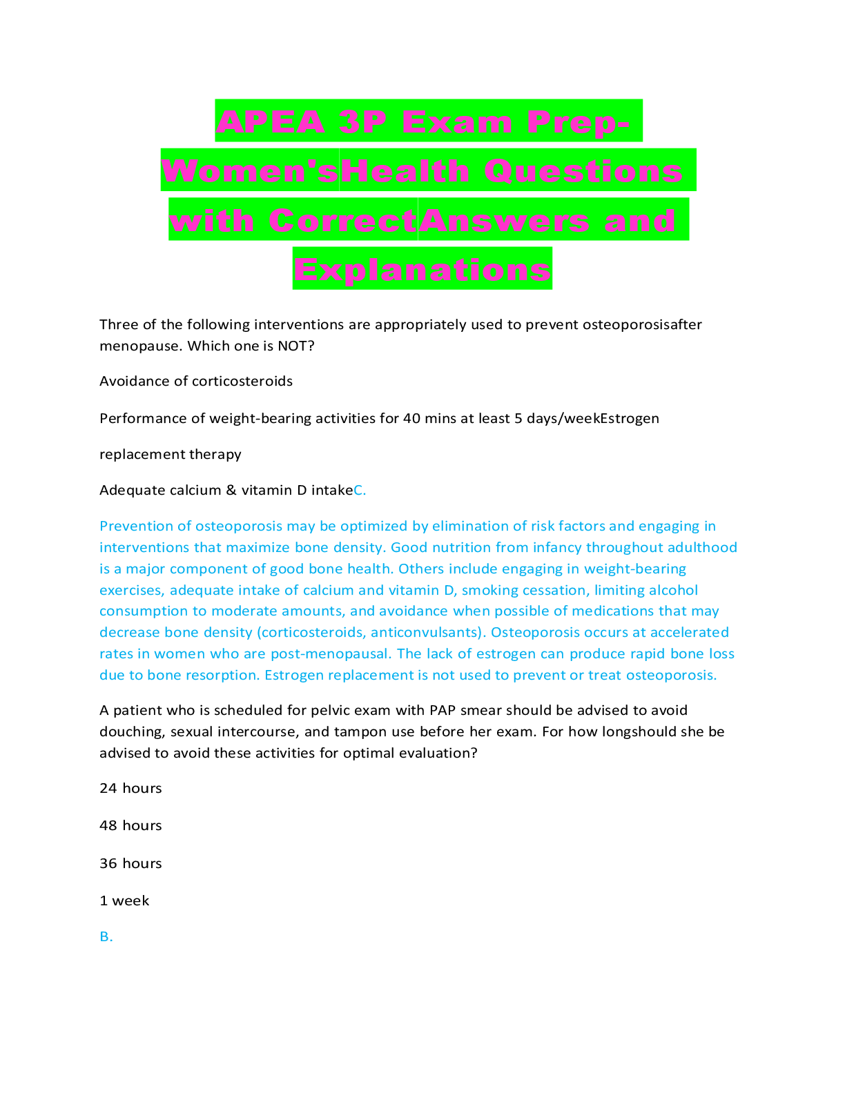 *NURSING > ATI MEDICAL SURGICAL > APEA 3P Exam Prep- Women's Health Questions with Correct Answers and Explanations
