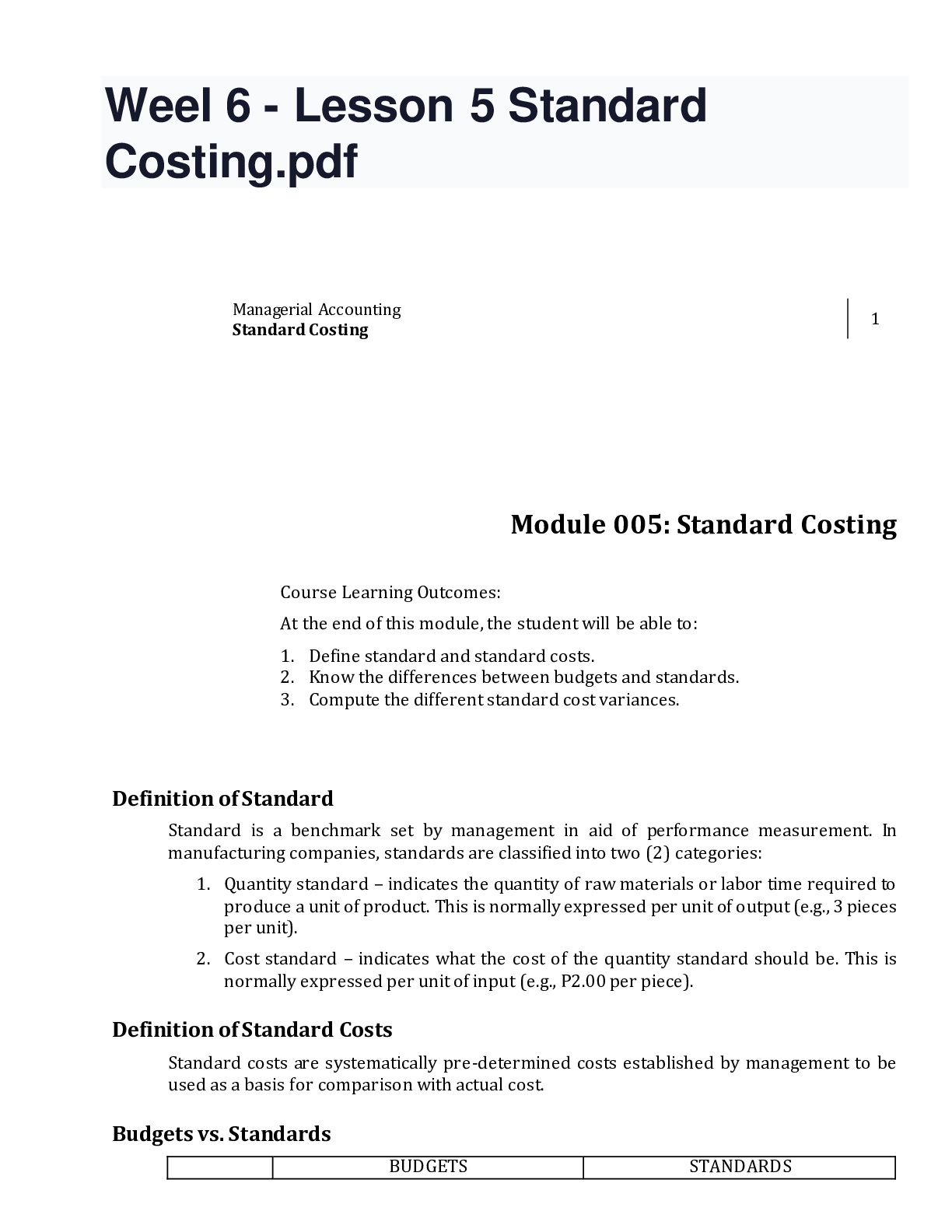 Managerial Economics > QUESTIONS and ANSWERS > Weel 6 - Lesson 5 Standard Costing.pdf