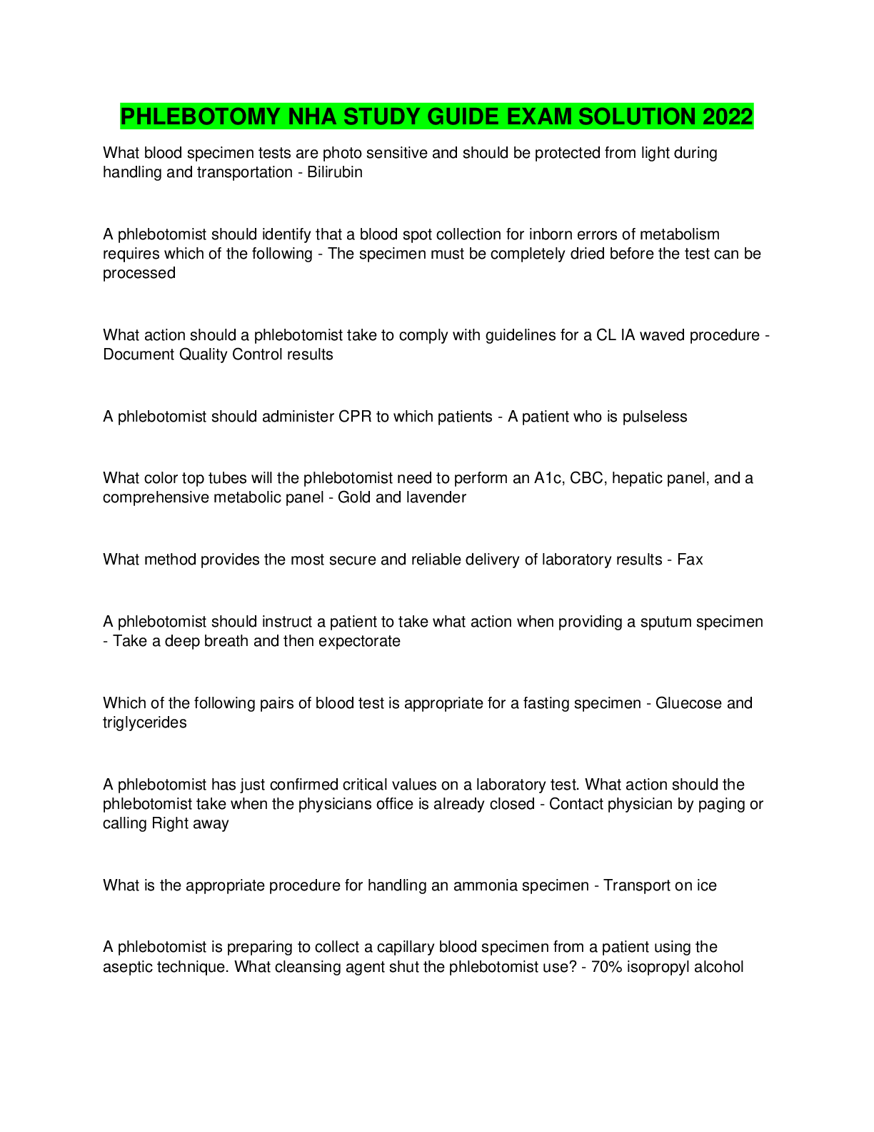 EducationQUESTIONS and ANSWERS  > PHLEBOTOMY NHA STUDY GUIDE EXAM SOLUTION 2022