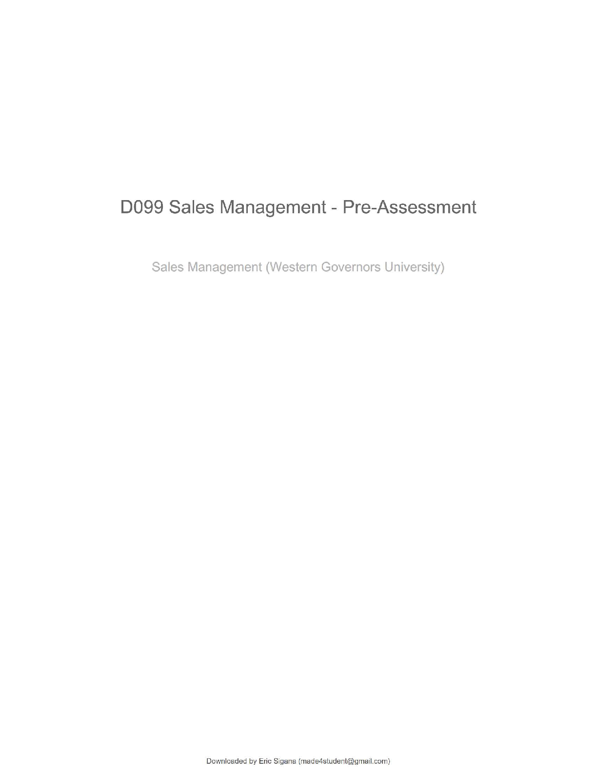 Business Management > QUESTIONS and ANSWERS > NB01 / Sales Management – Pre-Assessment (PNBO – Western Governors University) (Latest 2025): Complete Study Guide | Questions and Verified Correct Answers | 100% Accurate | Grade A