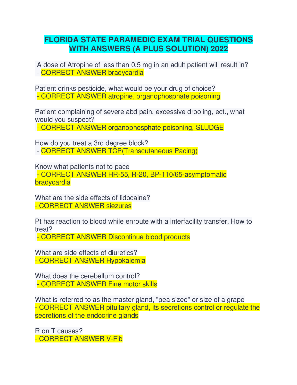 Education > QUESTIONS and ANSWERS > FLORIDA STATE PARAMEDIC EXAM TRIAL QUESTIONS WITH ANSWERS (A PLUS SOLUTION) 2022