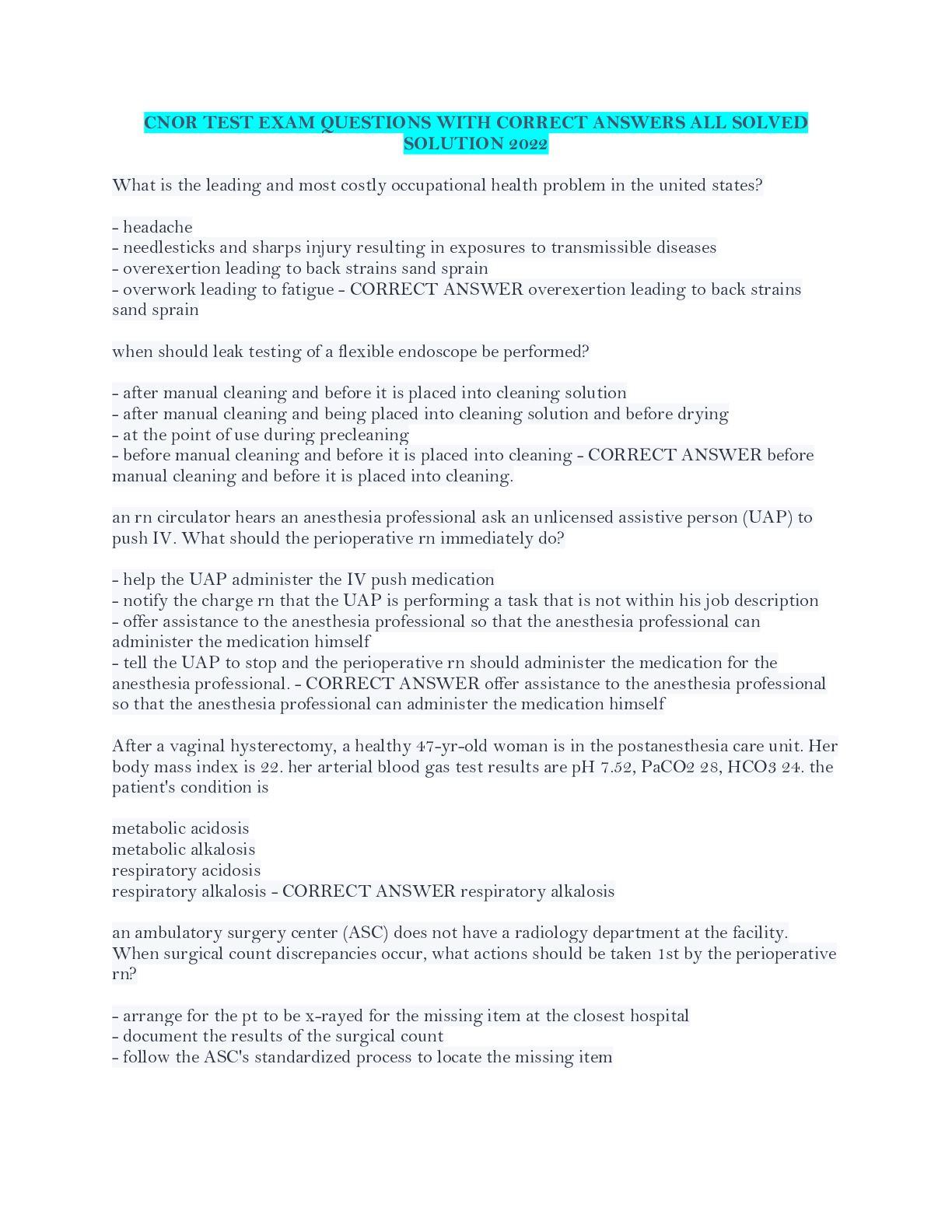 Education > QUESTIONS and ANSWERS > CNOR TEST EXAM QUESTIONS WITH CORRECT ANSWERS ALL SOLVED SOLUTION 2022