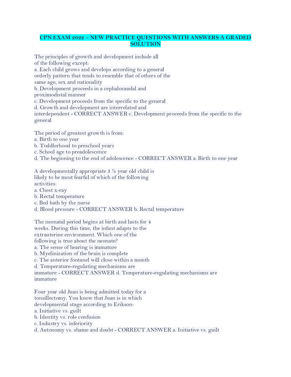 Education > QUESTIONS and ANSWERS > CPN EXAM 2022 – NEW PRACTICE QUESTIONS WITH ANSWERS A GRADED SOLUTION