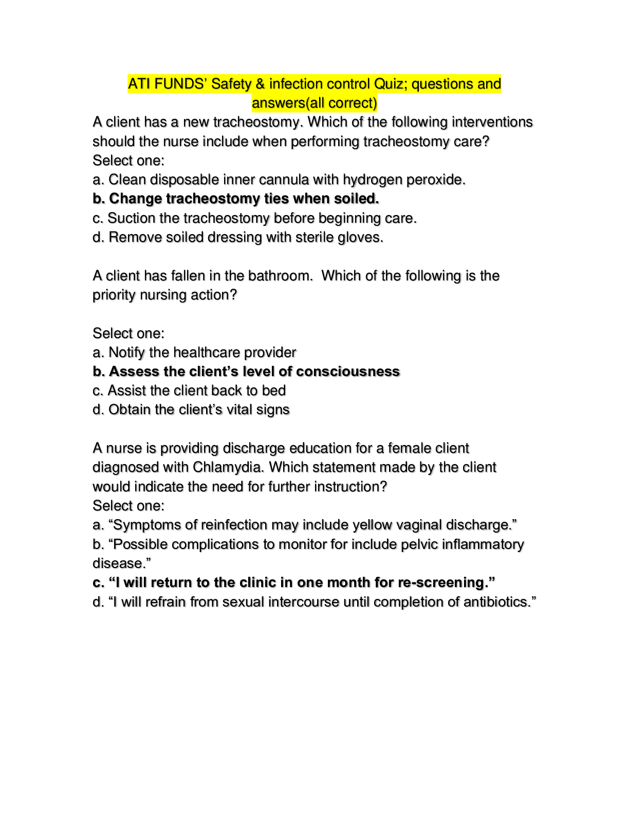 *NURSING > QUESTIONS and ANSWERS > ATI FUNDS’ Safety & infection control Quiz; questions and answers(all correct) lATEST 2021