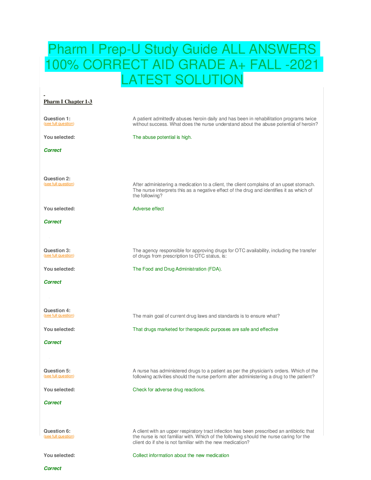 Health Care > QUESTIONS and ANSWERS > Pharm I Prep-U Study Guide ALL ANSWERS 100% CORRECT AID GRADE A+ FALL -2021 LATEST SOLUTION