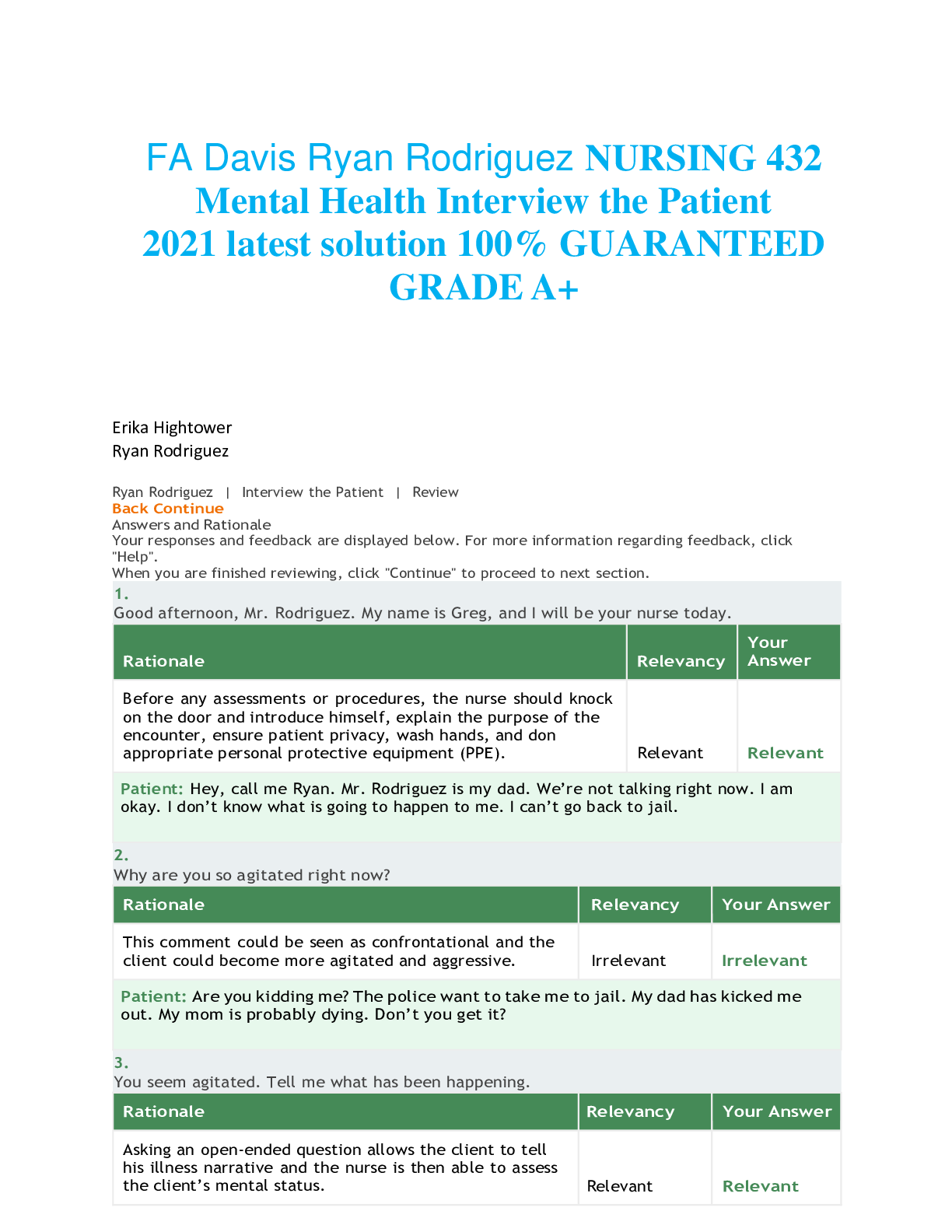 *NURSING > QUESTIONS and ANSWERS > FA Davis Ryan Rodriguez NURSING 432 Mental Health Interview the Patient 2021 latest solution 100% GUARANTEED GRADE A+