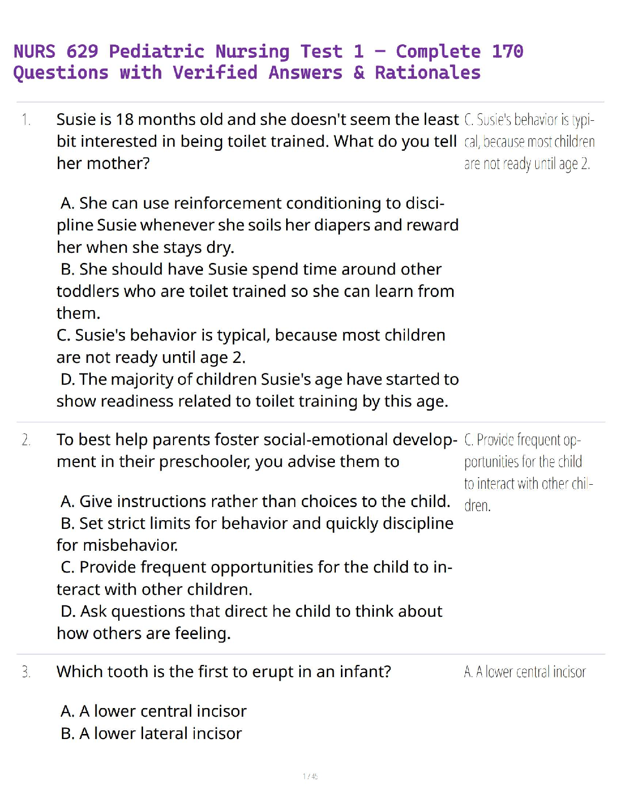*NURSING > QUESTIONS and ANSWERS > NURS 629 Pediatric Nursing Test 1 – Complete 170 Questions with Verified Answers & Rationales