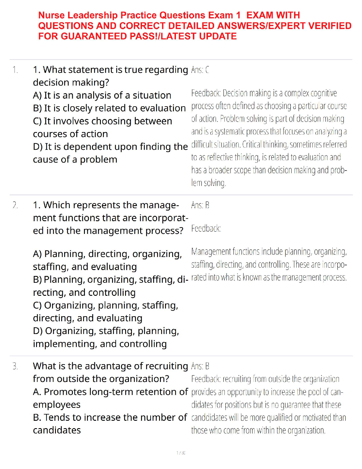 *NURSING > QUESTIONS and ANSWERS > Nurse Leadership Exam 1 – Practice Questions with Expert Verified Detailed Answers