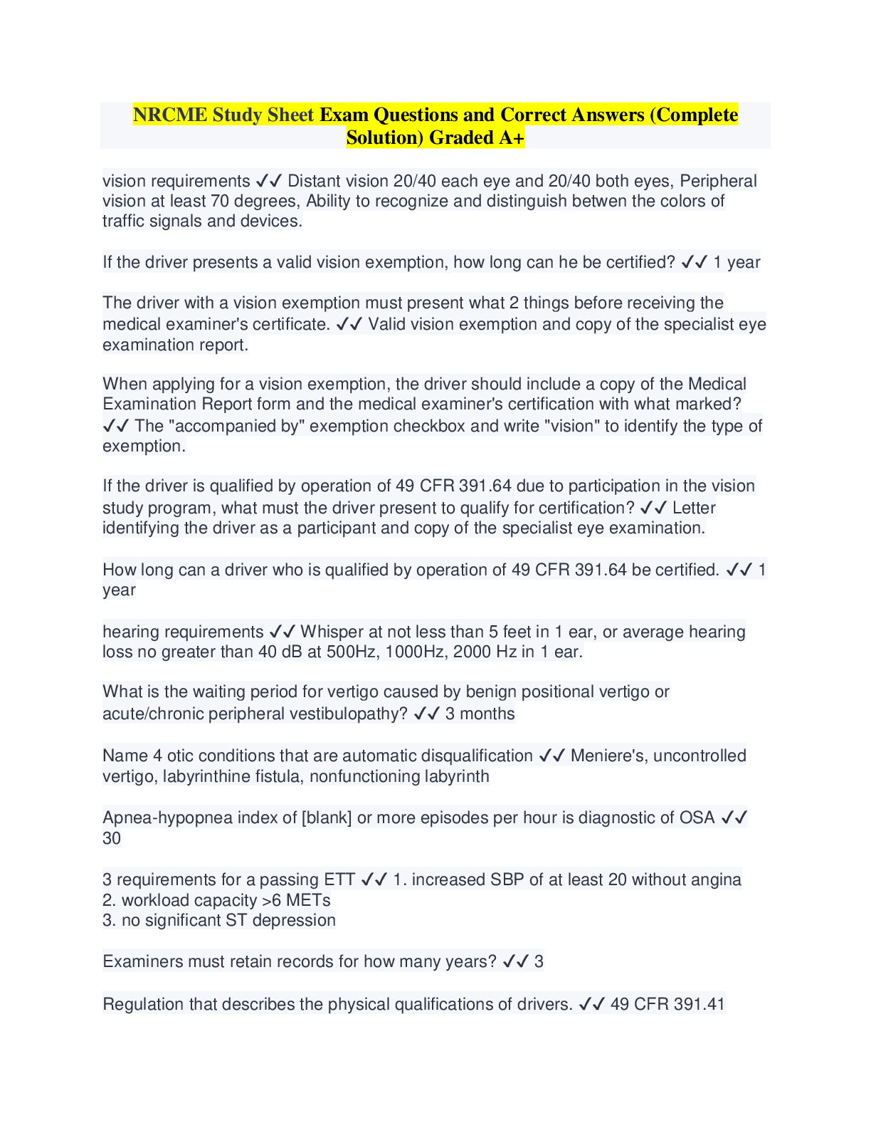 *NURSING > QUESTIONS and ANSWERS > NRCME Study Sheet Exam Questions and Correct Answers (Complete Solution) Graded A+