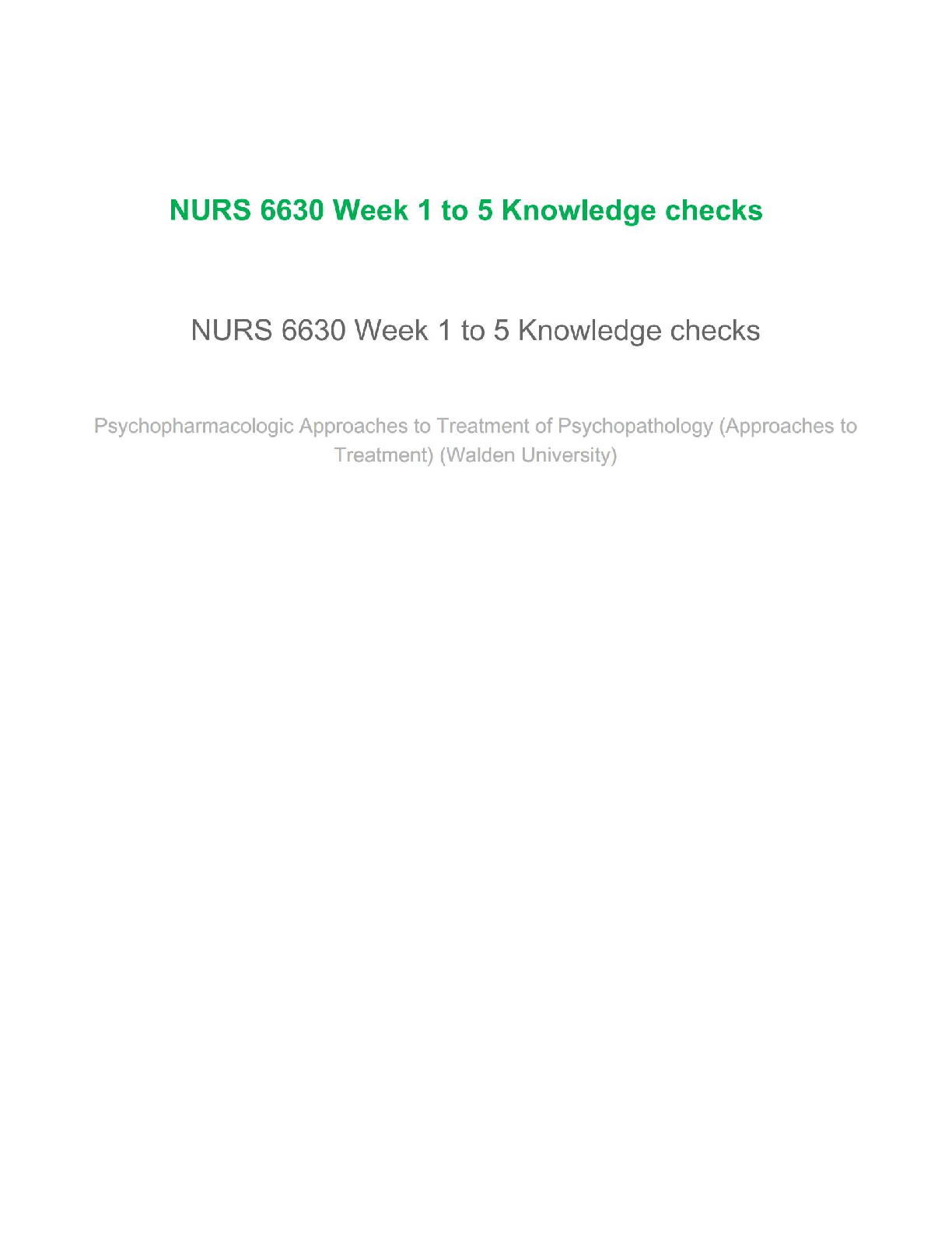 *NURSING > QUESTIONS and ANSWERS > NURS 6630 – Week 1 to 5 Knowledge Checks (2025) Walden University | Psychopharmacologic Approaches to Treatment of Psychopathology Grade A